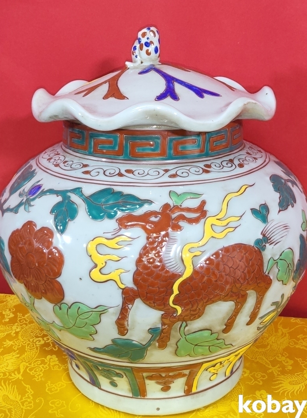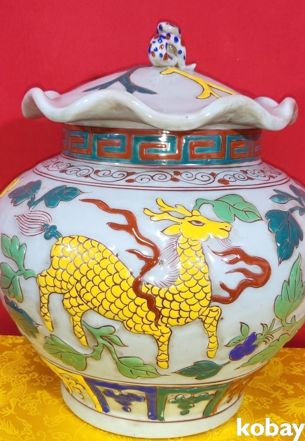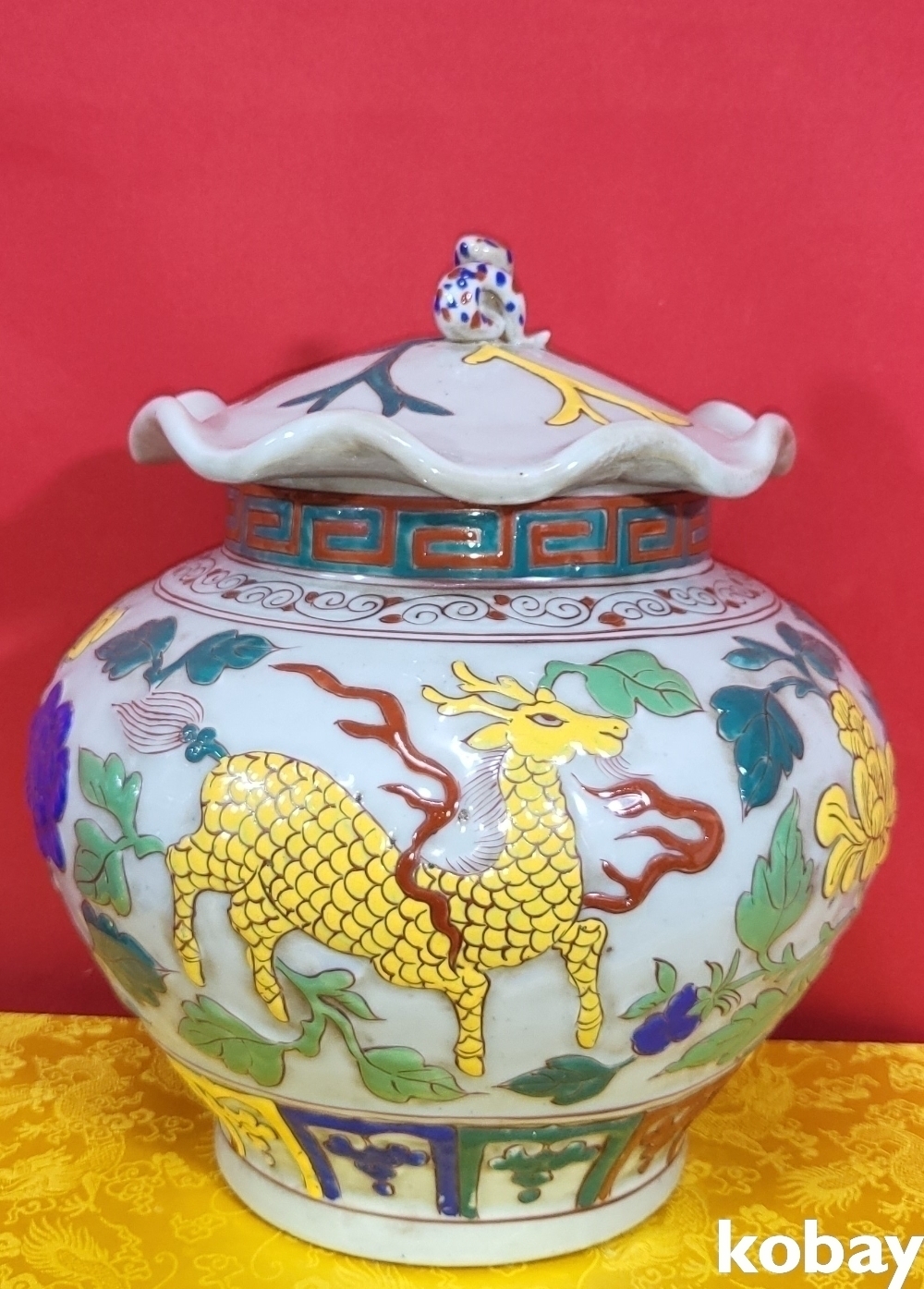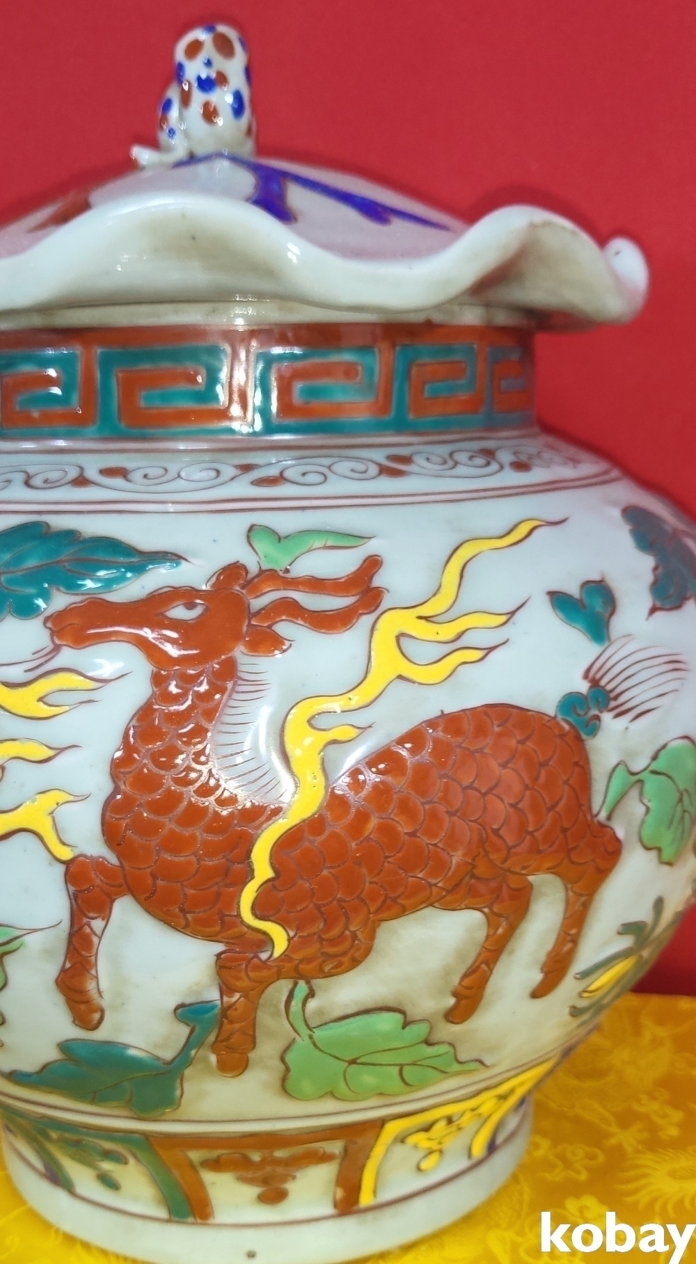 양명에 황색 홍색 사슴이 시문된 명품임니다,