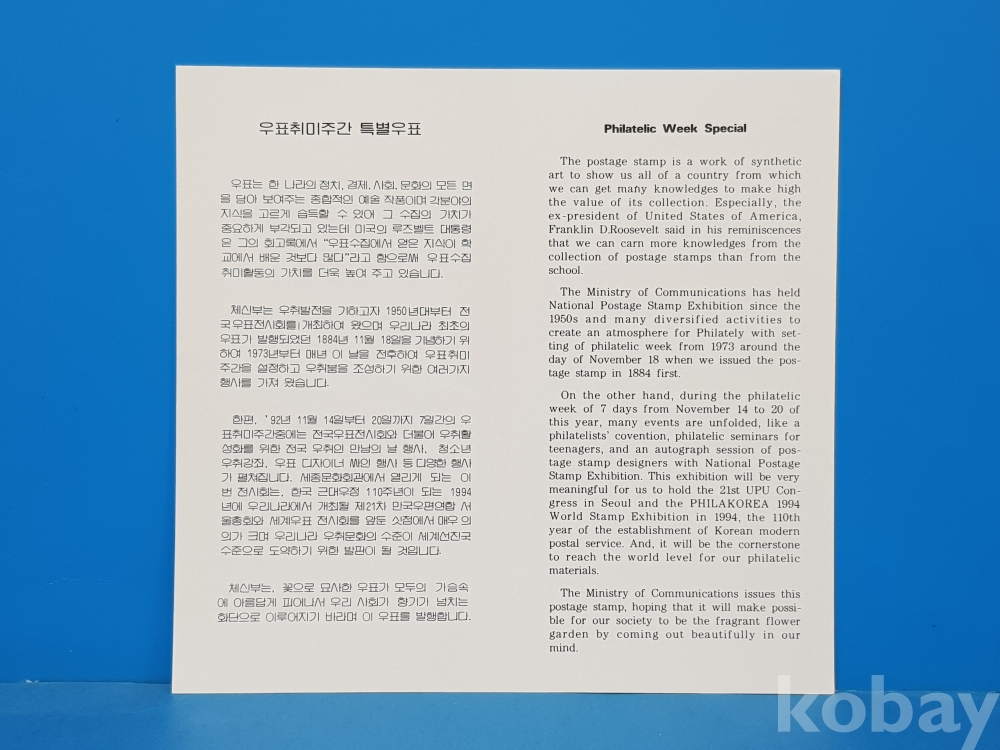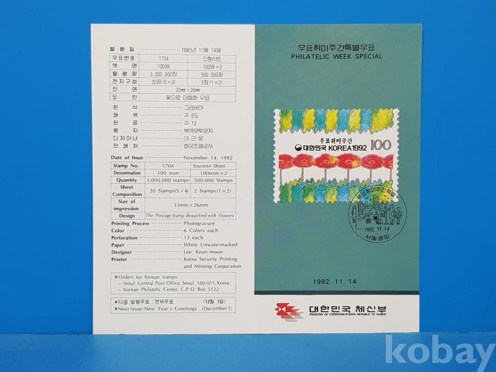 **** 우표취미주간특별우표/1992.11.14/대한민국 체신부*색 변함, 찢김, 접힘 등 있을 수 있음