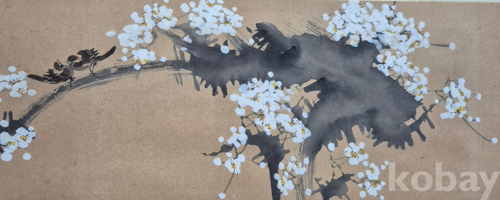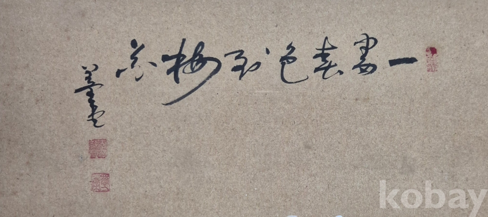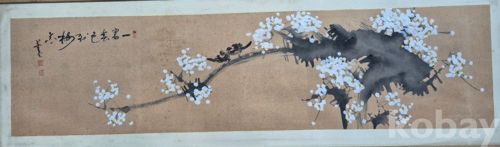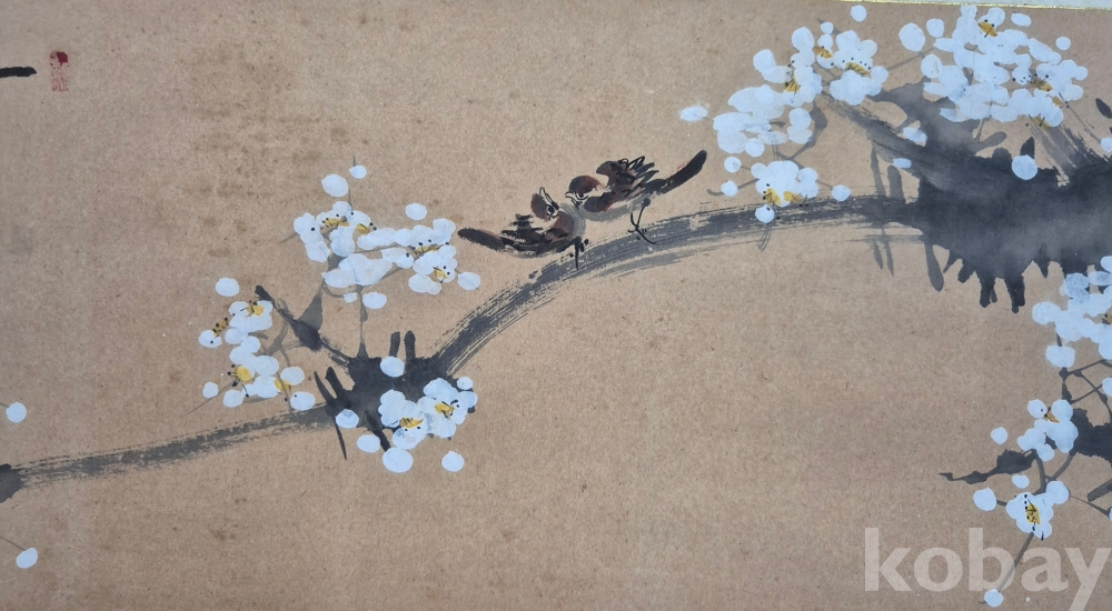 독특한 기법으로 잘 그려진 상당한 수준의 화가분 작품 추정되는 매조도'이오니 작품 이미지상 수결 및 낙관'등