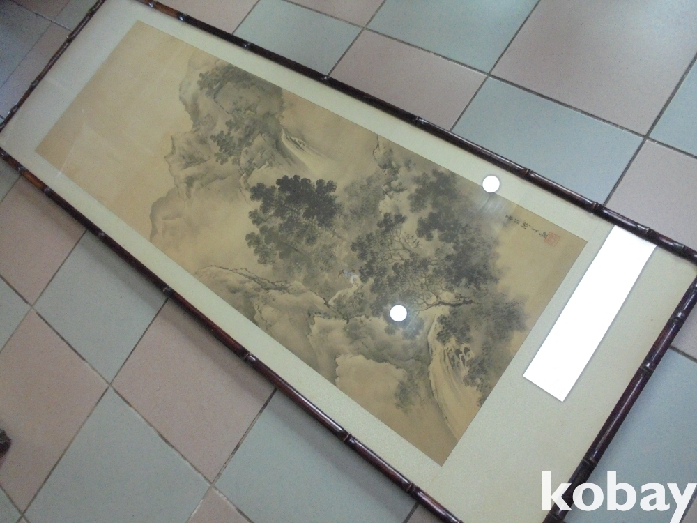 오래된 깊고 높은 폭포수에 낚시대메고가는 강태공 작가명알수없는 영적인 대형산수화 죽절액자