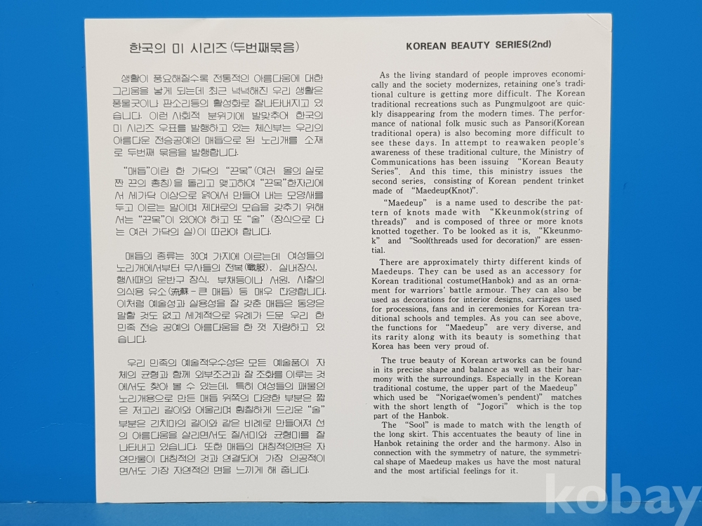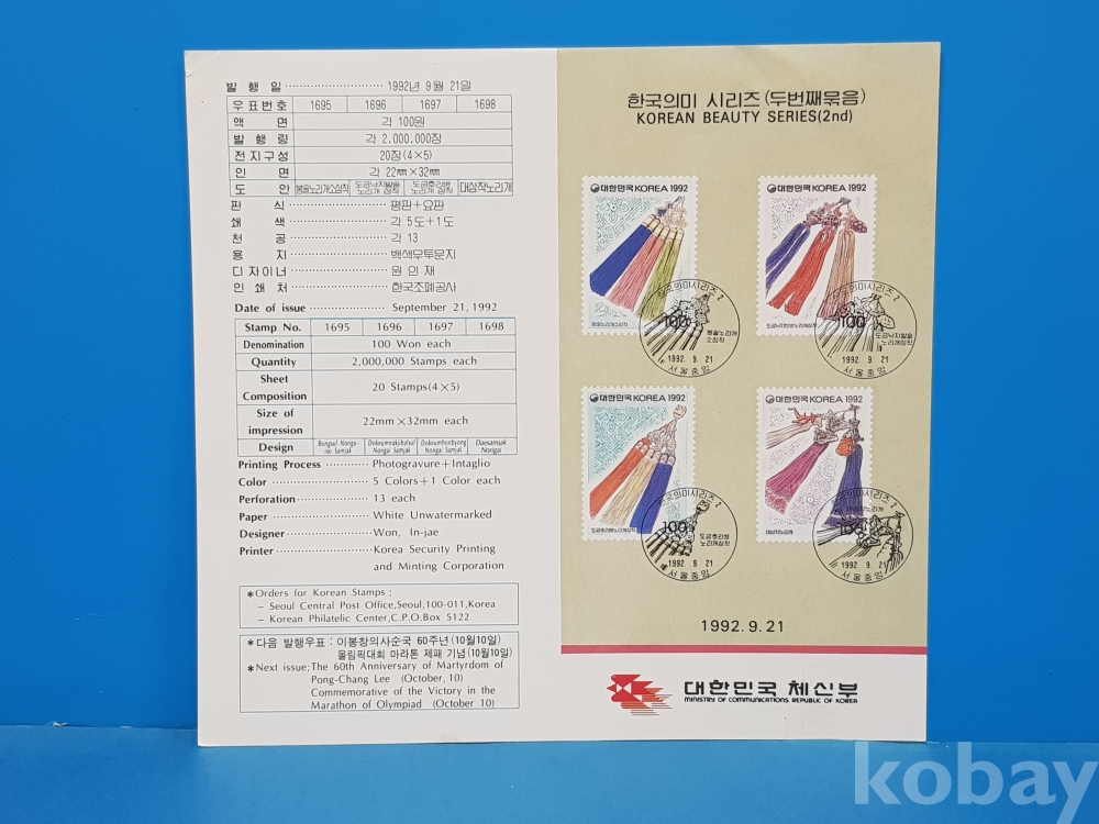 **** 한국의미 시리즈(두번째묶음)/1992.9.21/대한민국 체신부*색 변함, 찢김, 접힘 등 있을 수 있음