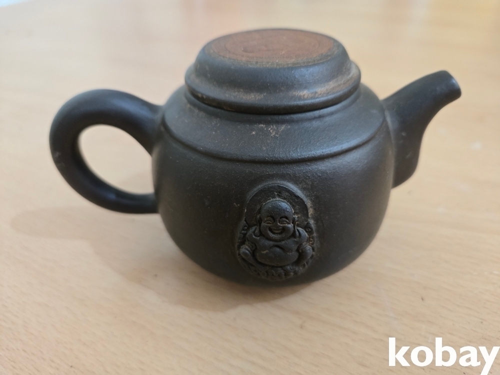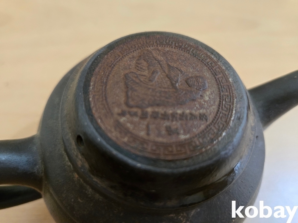 뚜껑 상단에 동전 모양이 붙어 있는 자사 주전자 입니다.