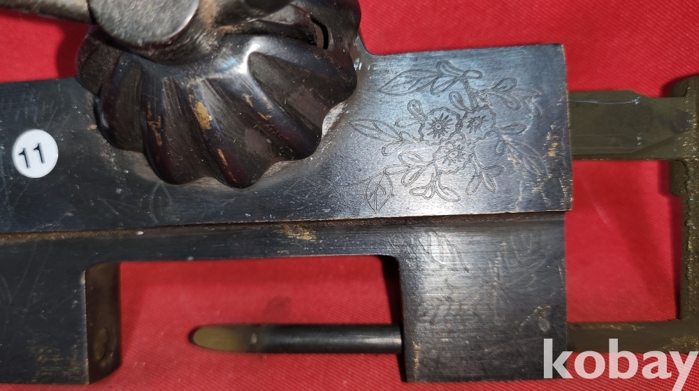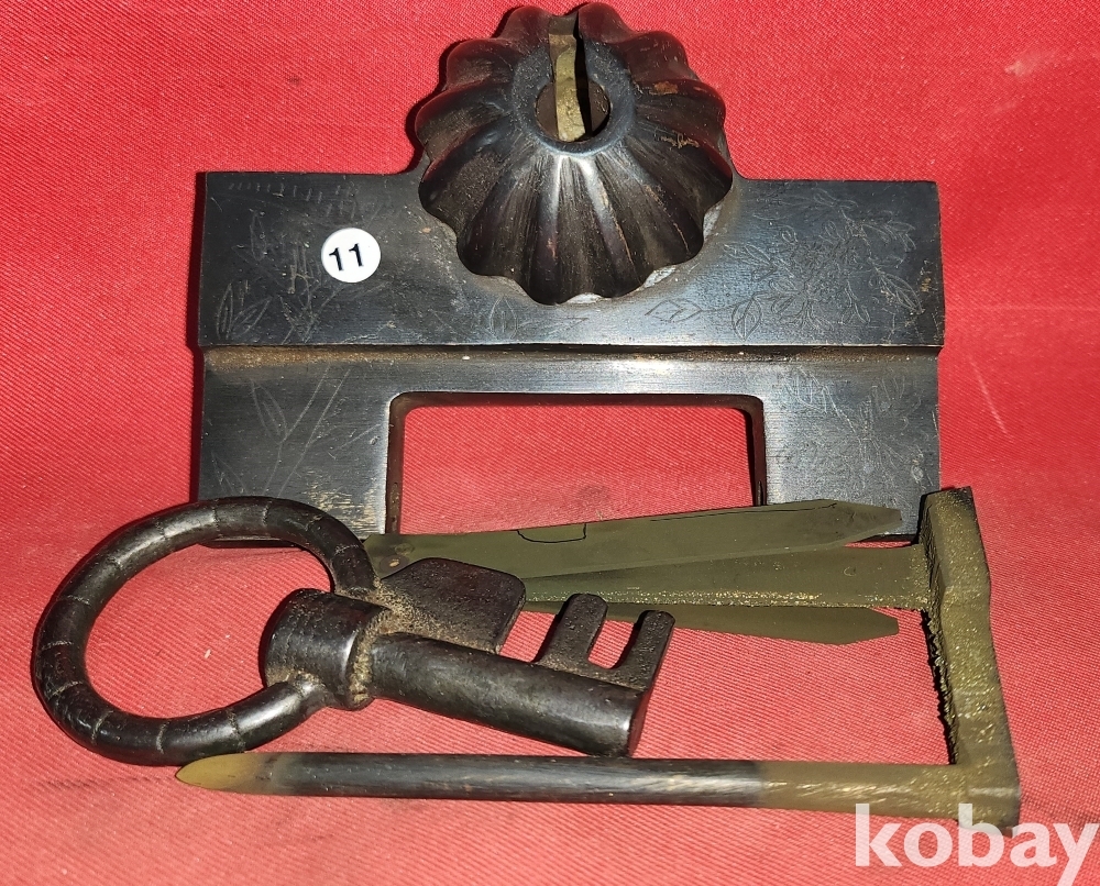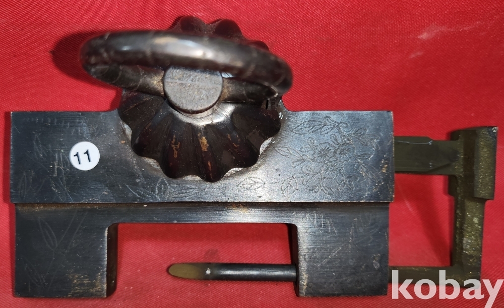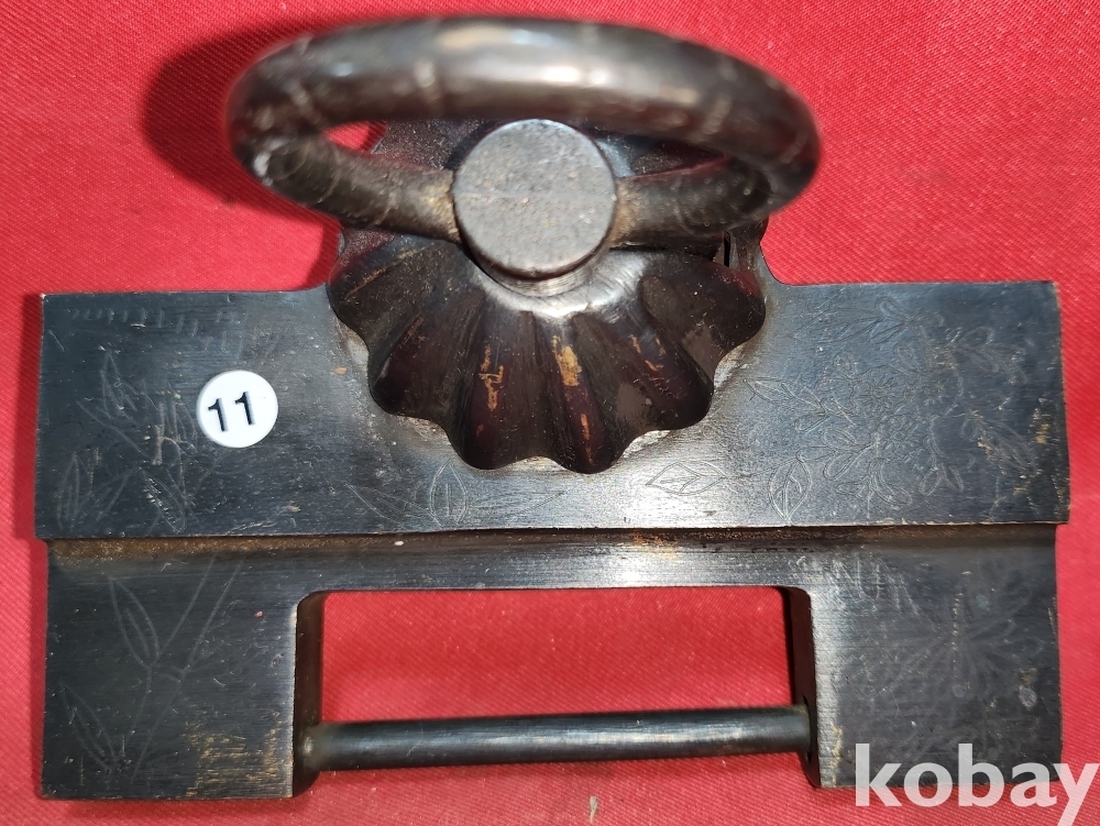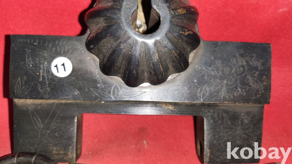 높은 연대를 갖춘 청동으로 만든 배꼽형 사군자 문양 자물통입니다,
