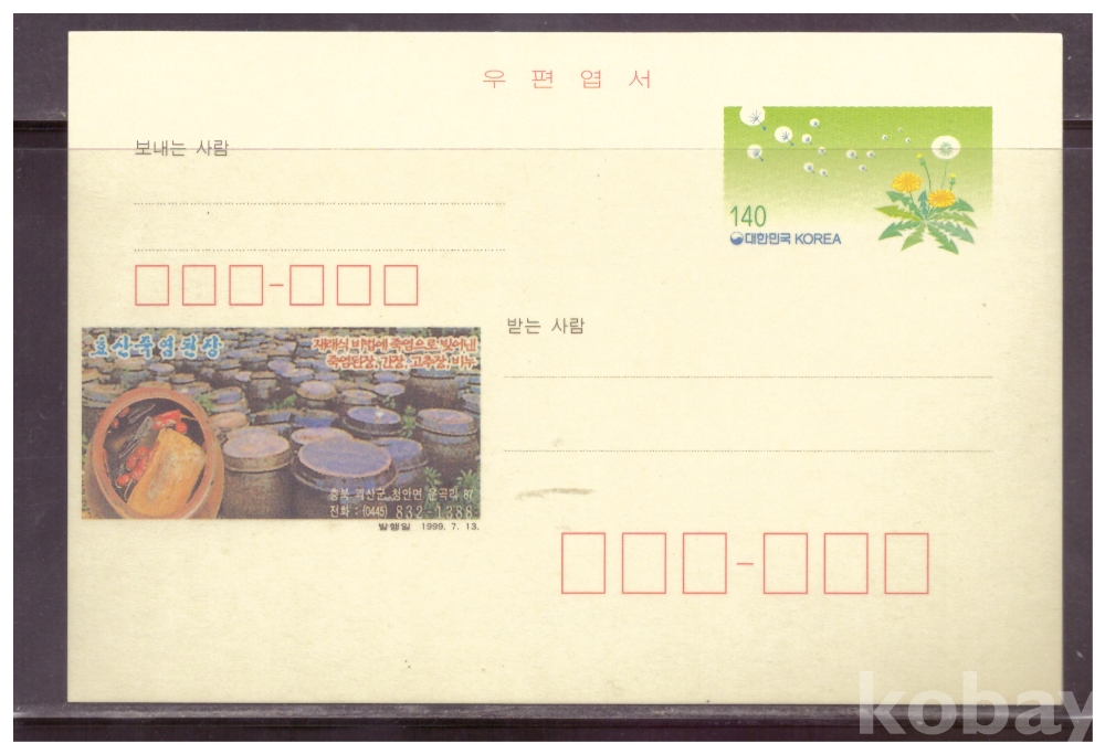 (광고엽서) 1999.7.13 지방판 LAPC311 효산죽염된장 (민들레 140원)