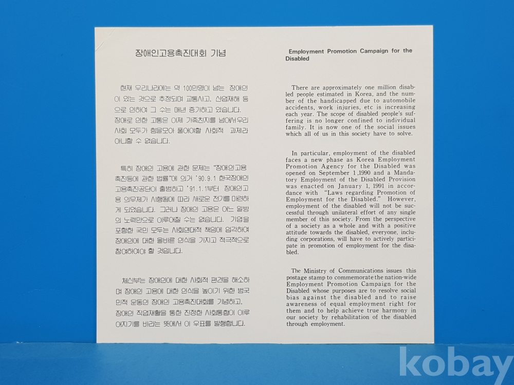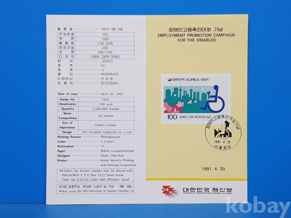 **** 장애인고용촉진대회 기념/1991.4.20/대한민국 체신부*색 변함, 찢김, 접힘 등 있을 수 있음