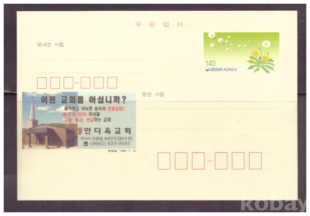 (광고엽서) 1999.7.15 지방판 LAPC323 안디옥교회 (민들레 140원)