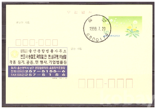 (광고엽서) 1999.7.20 지방판 LAPC336 울산종합법률사무소 (민들레 140원) (초일일부인)
