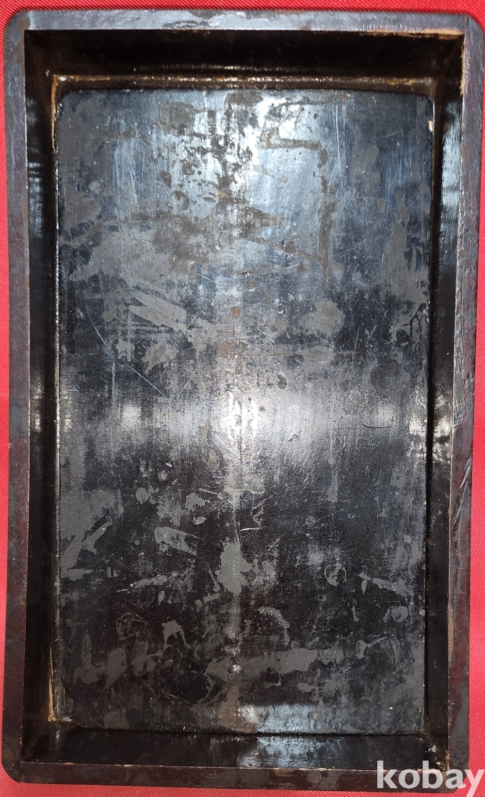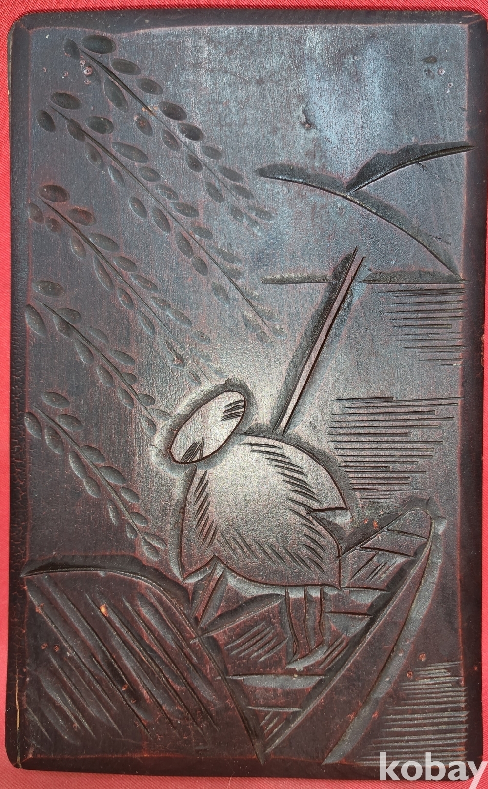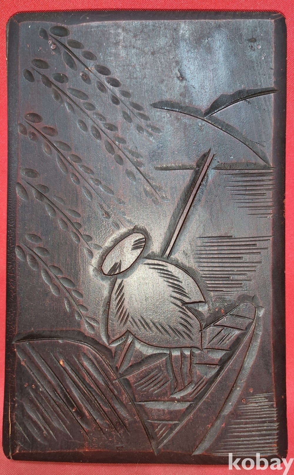 짱짱한 연대 나무로 만든 배 위에서 천연재료 비옷을 입고 삿대를 젓는 인물문양 벼루함입니다,
