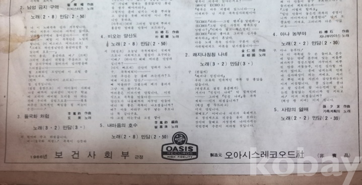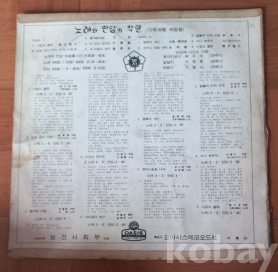 이 음반은 못본 사람이 많다해도 음반의 테마, 예전 “가족계획”은 모르는 사람들 없겠지. 한때 폭발하는 인구의 억제을 위해 딸아들 구별말고 하나만 낳아 잘 기르자라든가 혹은 아들 낳으면 열차타고 여행하고 딸 낳으면 비행기타고 여행을 한다는 등 귀에 따다구가 앉을 정도로 들었지요. 범정부차원에서 계몽/홍보에 난리들이었고. 그러이 당시 주무부처랄 보건사회부에서 이런 비매품의 홍보용 음반도 만든다 했을거고. 뿐인가 반상회때 산아제한, 임신 예방을 위한 루픈가? 하고 당시 희안한 물건? 콘돔도 나누어 주어.. 어린애들이 풍선대신 불고 골목 뛰어 다니는 웃지못할 진풍경도 벌어졌지요. 특히 그때에 우리는.. 좀 위 나이에 남자들은 불알까는 정관수술 유혹도 많이 받았고, 예비군 훈련면제에 아파트 추첨 우선권을 준다는 등 유혹이 많았지요. 그때 가마있는 붕알 몇 번씩 만져 보면서 깔까말까 망설였을거고. 나도 그랬네요. 실제로 내 아는 형은 그때 불알까서 혜택 마이 받았다하고. 그래서 그 친군 요새 땅땅 거리며 살고. 첫곡과 마지막 수록곡 “가족계획의 노래”는 참 낮설지요. 아무튼 지금 생각하면 참 격세지감이고. 요샌 그 반대로 온 나라, 아니 세계가 인구증가 정책한다고 떠들썩 하고.. 마지막으로 그 친구가 그카네요. 무슨 돼지새끼 거세하는것도 아인데 무식하게 불알까다이, 정관수술이라 해야 맞지하고,,