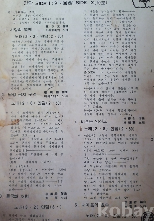 SIDE 1. 1. 사랑의 열매(손석우 작곡,가족계획의 노래)/노래(2.2)만담(2.30).