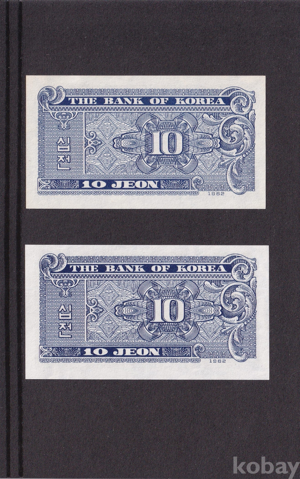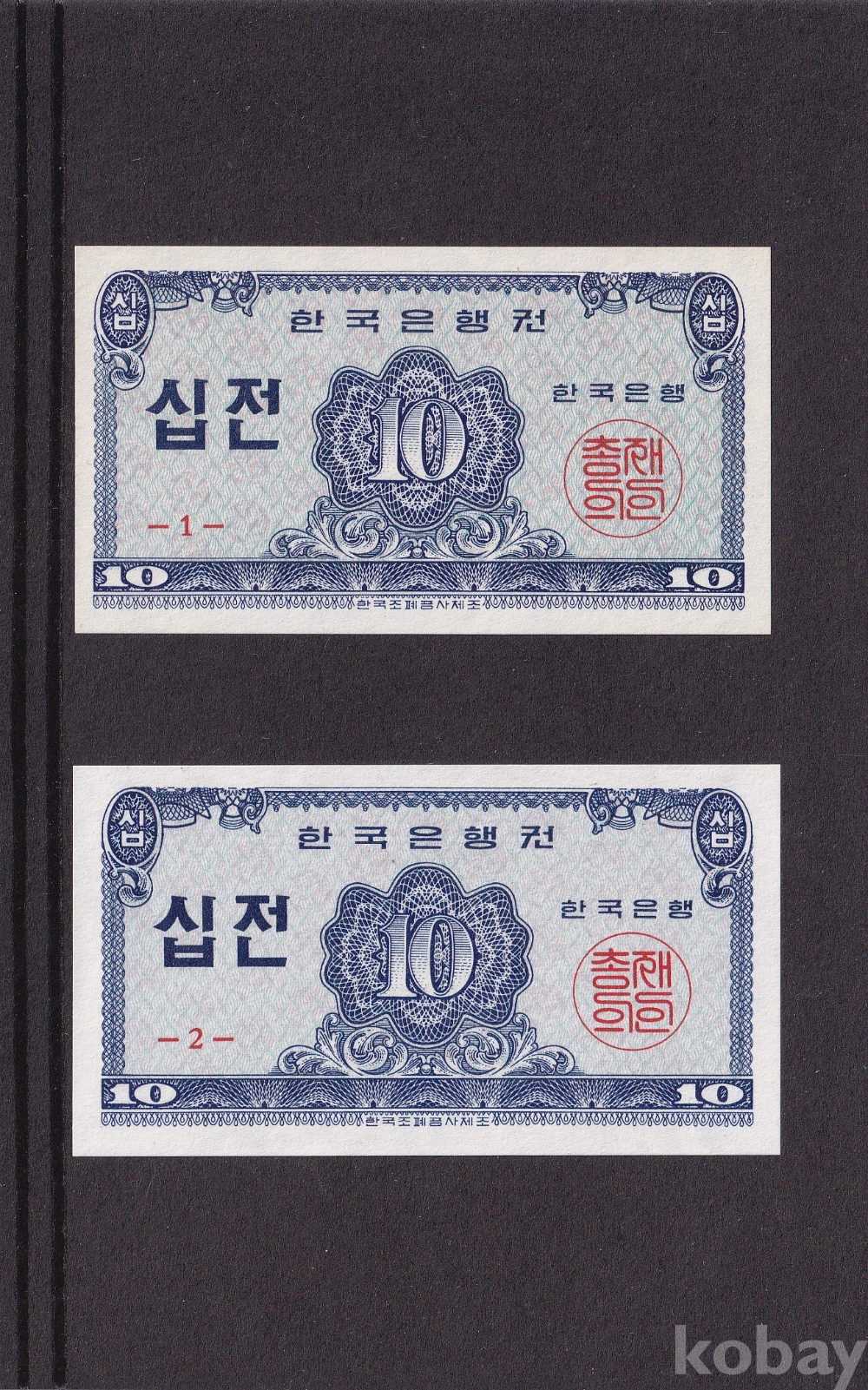 - 한국은행 1962년 소액 십전 판번호 1번 / 2번 미사용 지폐 - 2장 일괄
