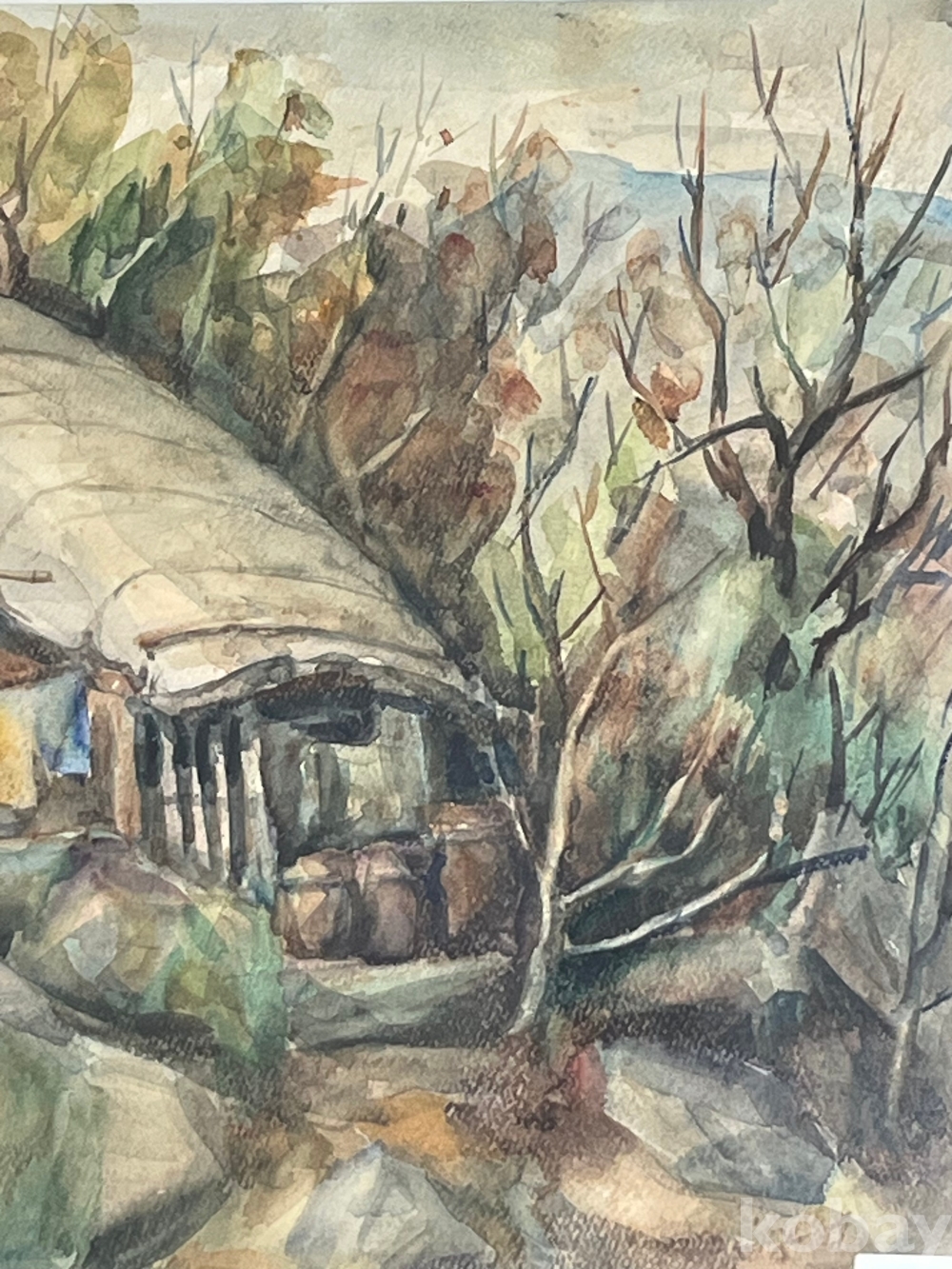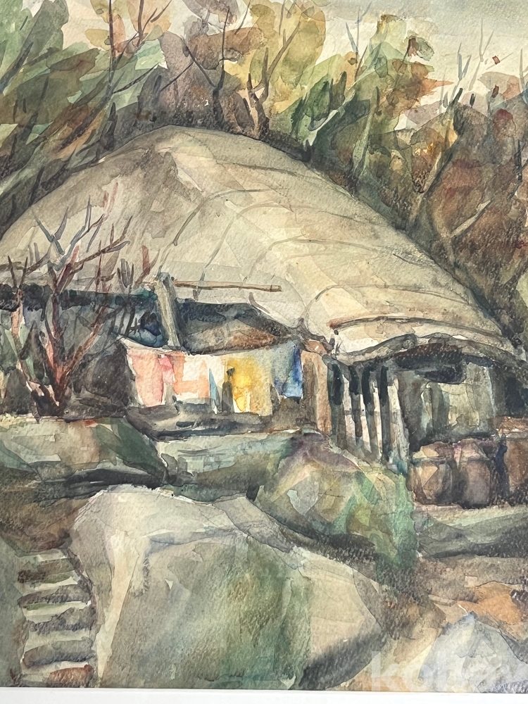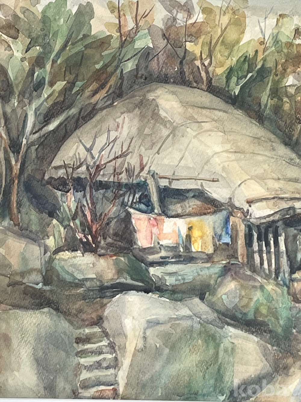 이 작품은 수채화가 이강조 화백이 한국의 전통 민가를 주제로 그린 수채화입니다.