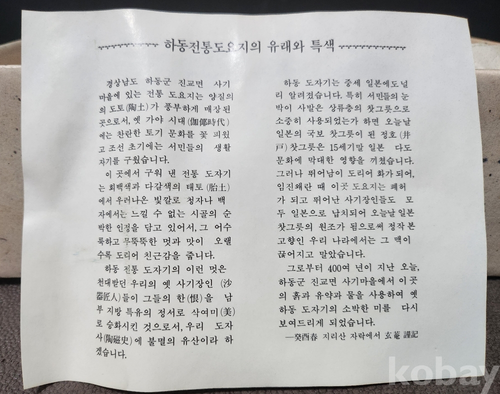 하동군 진교면 백련리 도자기의 우수성을 널리 알리고 있다.