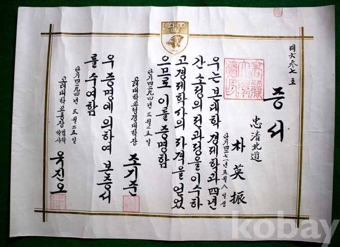 (상장 및 졸업장) 1961년 고려대학교 경제학과의 졸업장