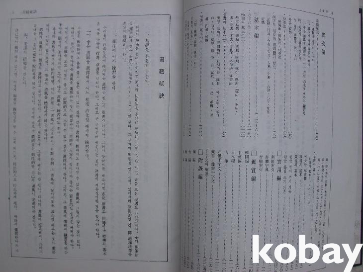 서예의 초심자는 물론이고 교양인의 필휴의 책이라는 추천자의 서문이 있다. <총목차>가 있다. 이 책은 앞에 개설로 '서예비결'을 싣고 기본편, 실용편, 감상편, 부록편으로 나누어 여러 자료와 서체를 공부하고 참조할 수 있도록 하였다.