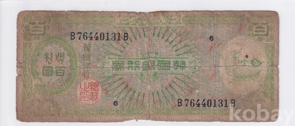 - 한국은행 1963년 거북선 미제 백환(원) 판번호 6번 사용제 지폐