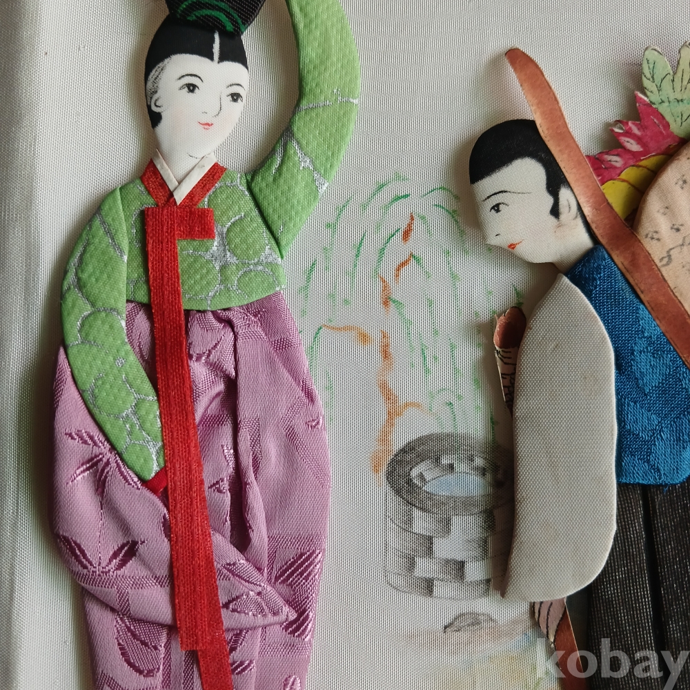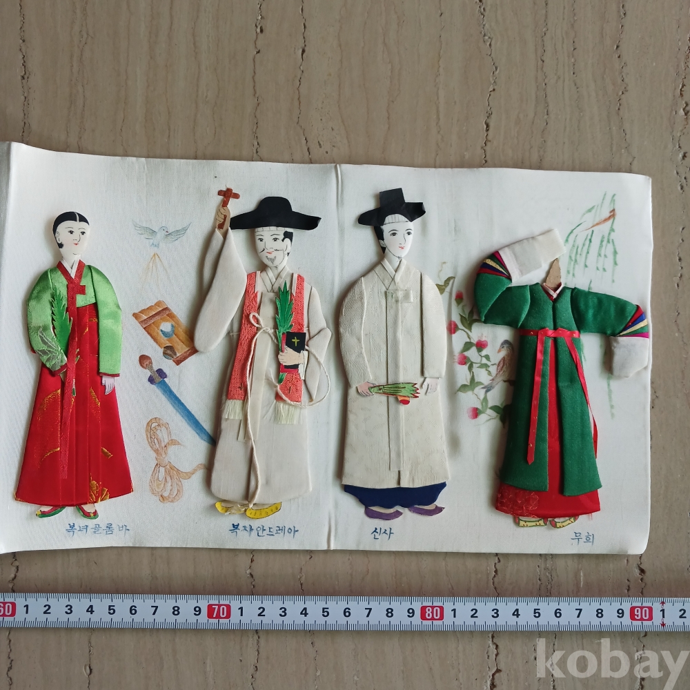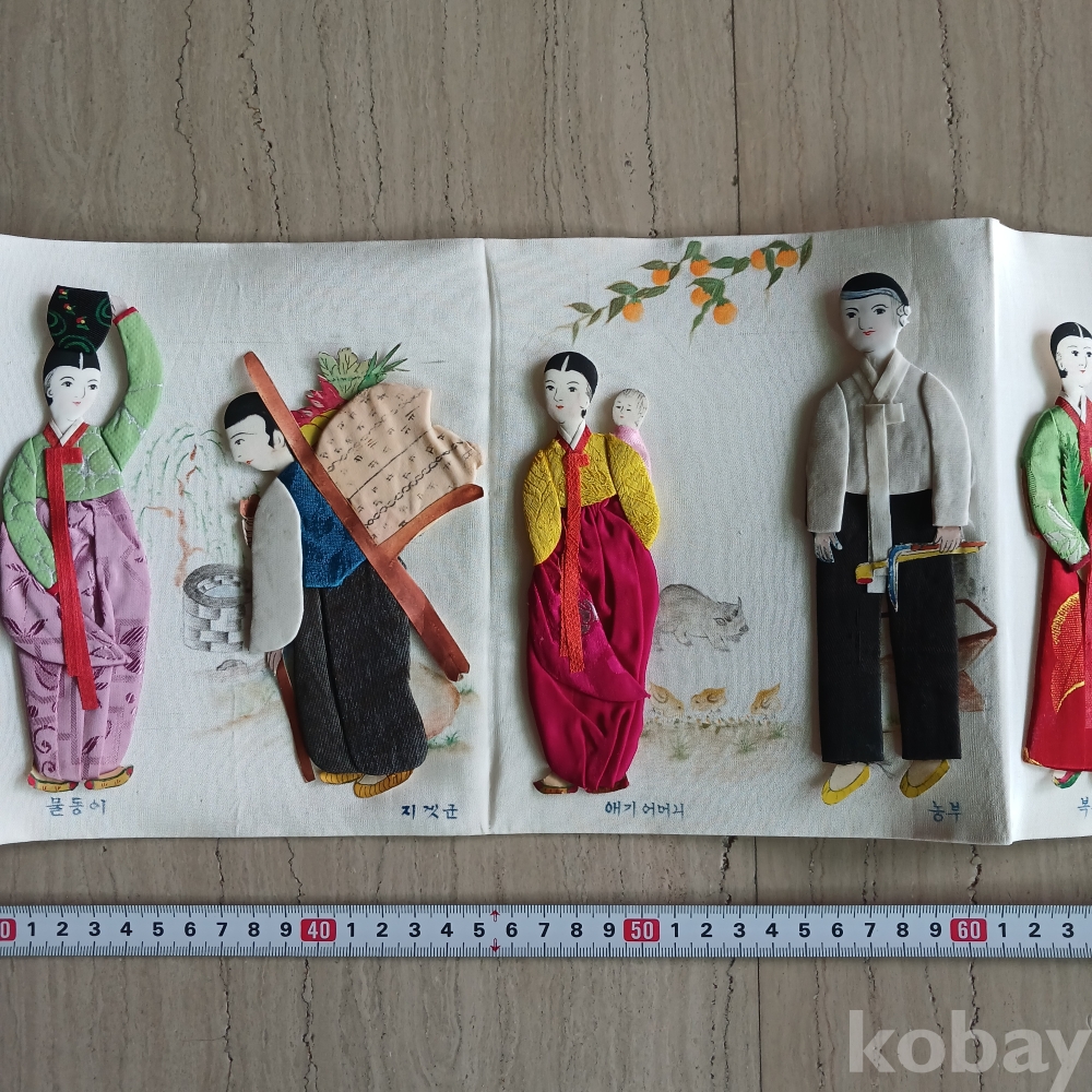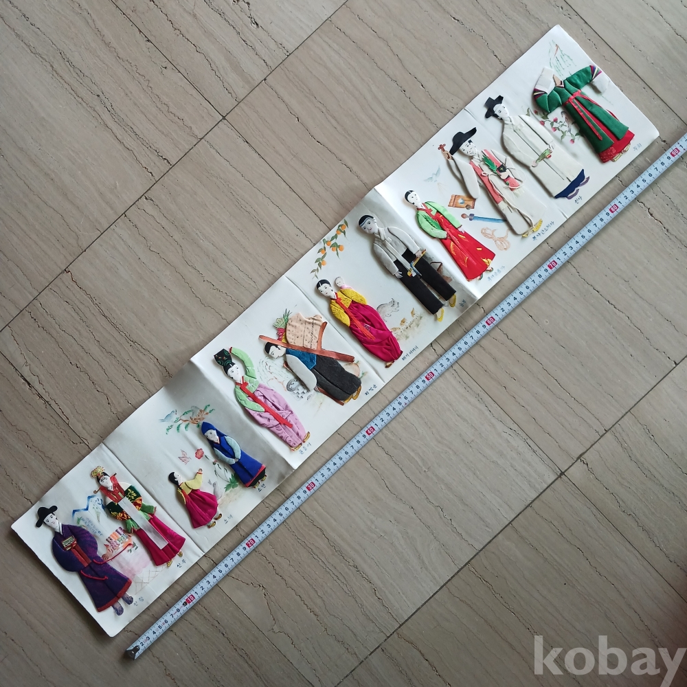 해방직후 한국을 상징하는 전통의상의 백성의 모습을 장르별로 조각천으로 인형을 만들어 밑그림을 그리고 그기에 걸맞는 분위기로 연결한 병풍형의 귀한 근대사 유물입니다 가톨릭 사제도 있군요 기생의 머리 하나가 분실된 상태입니다ㆍ 액자를 길게 하면 멋질 꺼 같으네요ㆍ근대사 유물입니다