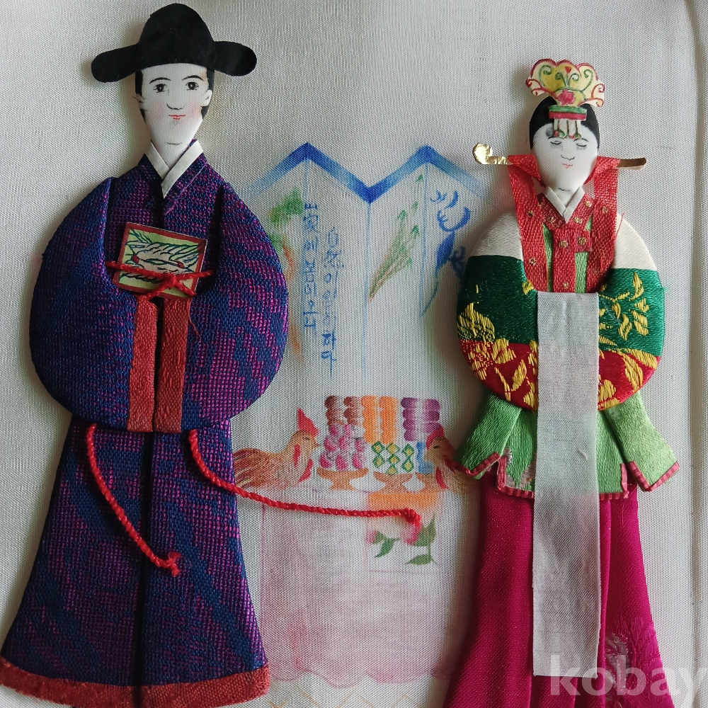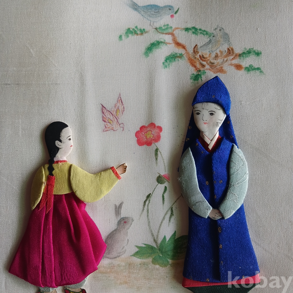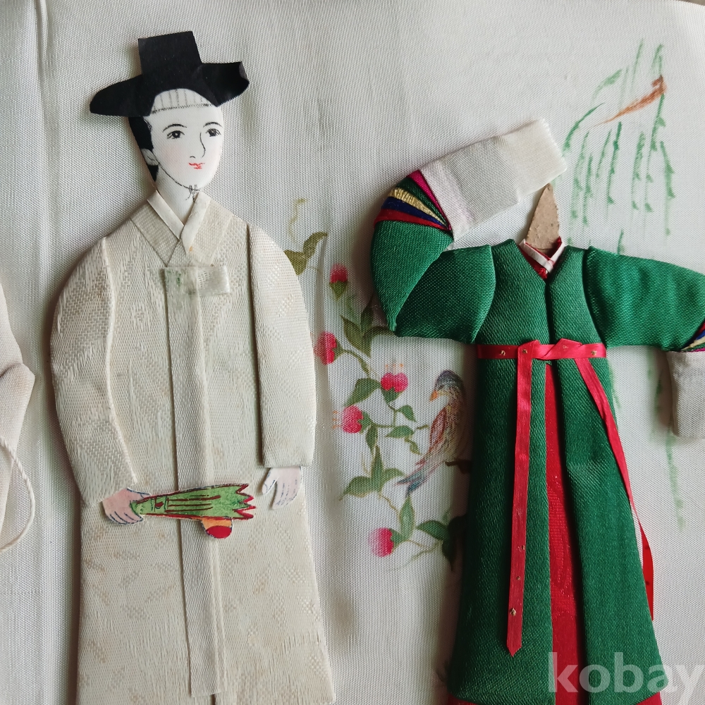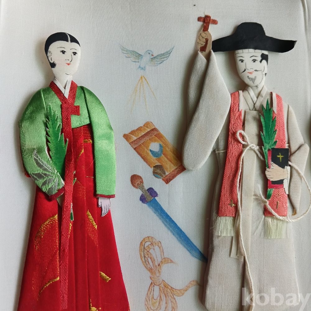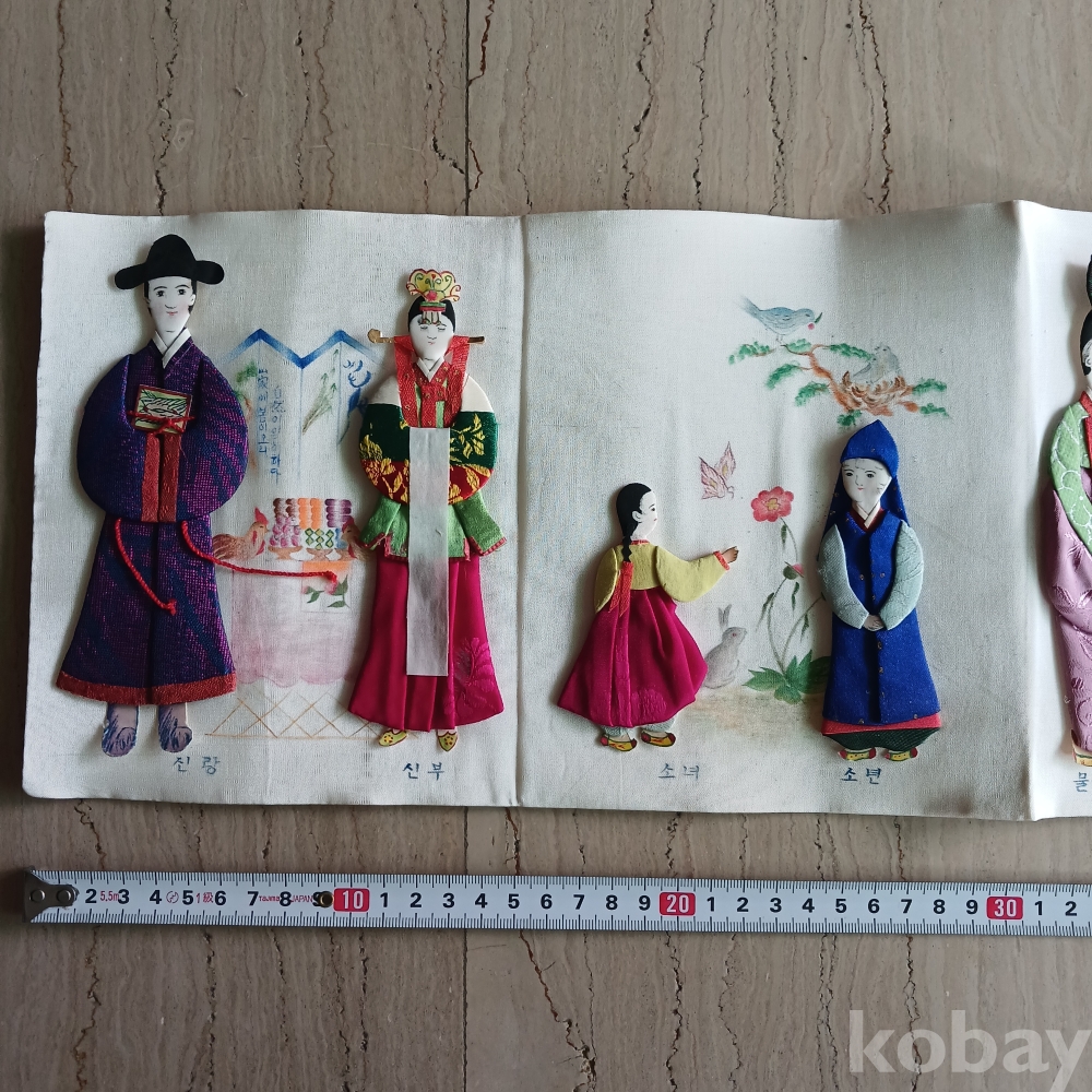 해방직후 한국을 상징하는 전통의상의 백성의 모습을 장르별로 조각천으로 인형을 만들어 밑그림을 그리고 그기에 걸맞는 분위기로 연결한 병풍형의 귀한 근대사 유물입니다 가톨릭 사제도 있군요 기생의 머리 하나가 분실된 상태입니다ㆍ 액자를 길게 하면 멋질 꺼 같으네요ㆍ근대사 유물입니다