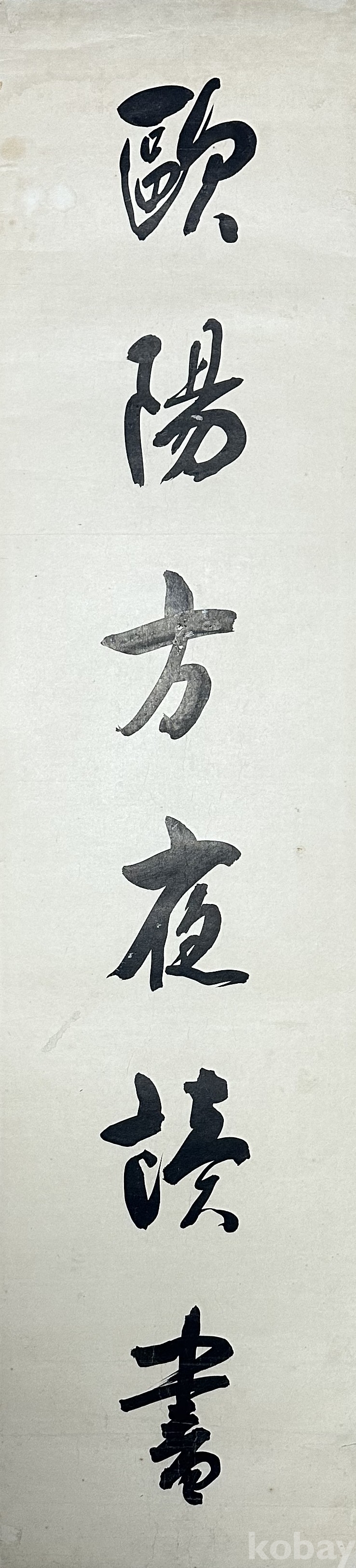 '음양방야독서(陰陽方夜讀書)'는 “음양(陰陽)이 조화를 이루는 밤에 독서를 한다”는 뜻으로, 동양 철학의 자연순환·조화, 그리고 밤의 고요 속에서 지식을 닦는 지적 삶의 의미를 담고 있습니다. 유려한 한자 필치와 한지의 깊은 질감이 어우러져, 학문과 마음가짐을 강조하는 전통 서예의 미학을 잘 드러내는 작품입니다.