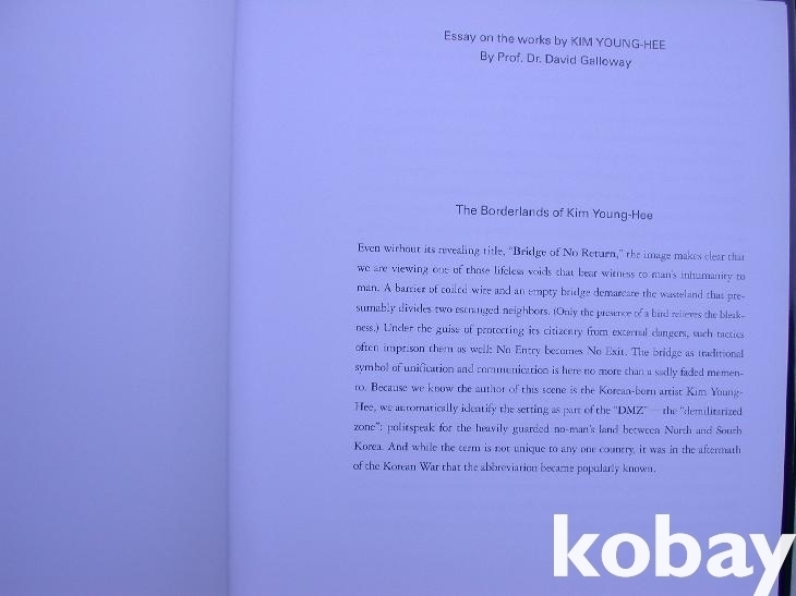 앞날개에 1944년 해주 태생의 미술가 김영희에 대한 소개가 있다. 200만부 이상 판매한 <아이를 잘 만드는 여자>의 지은이였던 그녀는 이제 닥종이인형작가에서 이만큼 미술세계가 넓고 커졌다. 영국왕립예술학회이 교수이자 특별회원인 데이비드 갤러웨이의 평문이 영문으로, 그리고 그 다음에 한글로 번역되어 실려 있다. 여기서 갤러웨이는 김영희의 설치미술에 재치있는 매력이 숨어 있다며 이야기를 풀어간다. 재현된 배경에서의 퍼모먼스로서의 설치물은 다시 사진기록물인 프린트만 남기고 버리거나 재활용된다고 하였고, 그녀가 무대 공부를 한 연출가이자 공연자이기도 하다며 디오라마나 영화/연극적 맥락의 이해도 도와준다. 또한 반복적 주제로 독일에 사는 한국인 예술가로의 '문화적으로 분열된 자아'를 거론하며 "모든 규범에 대한 반란이 바로 '펑크적'이라는 단어로 압출될 수 있는 것"이라고 하였다.
