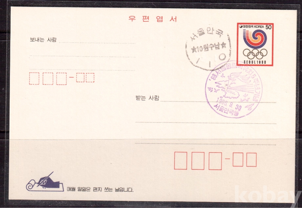 (서울올림픽) 1988 서울올림픽 50원+10원수납 (엠블렘) 엽서 (서울안국)