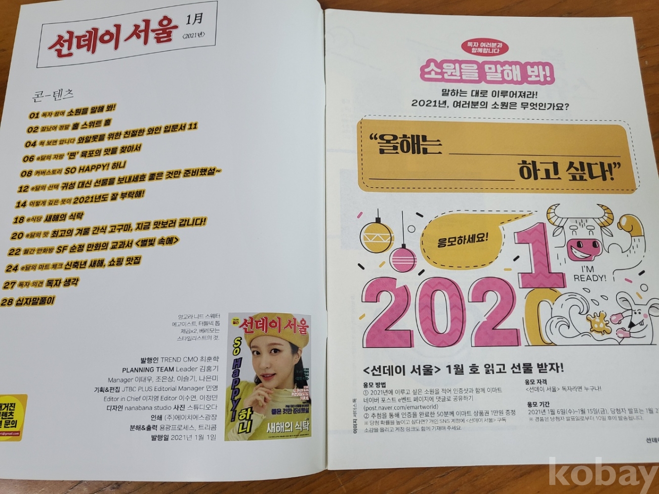 1. 선데이 서울 2021년 1월호, 이마트, 2021년, 28쪽, 월간, 비매품, 이마트 소식지, 표지 모델(배우 안희연), 상태 상, 사진 참조
