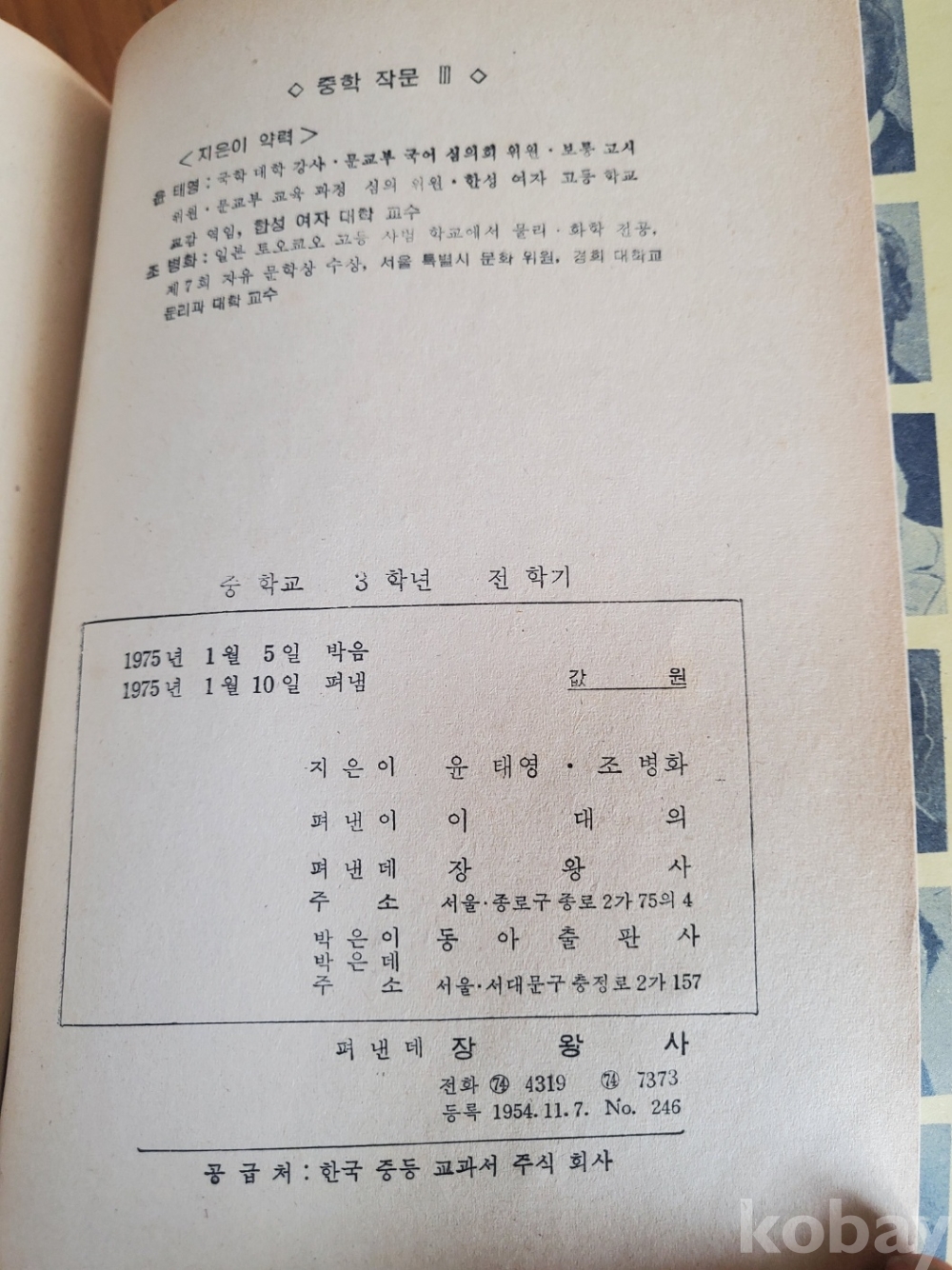 1. 중학작문Ⅲ(장왕사, 1975년), 지은이 조병화 윤태영, 장왕사, 1975년, 114쪽, 상태 상, 사진 참조