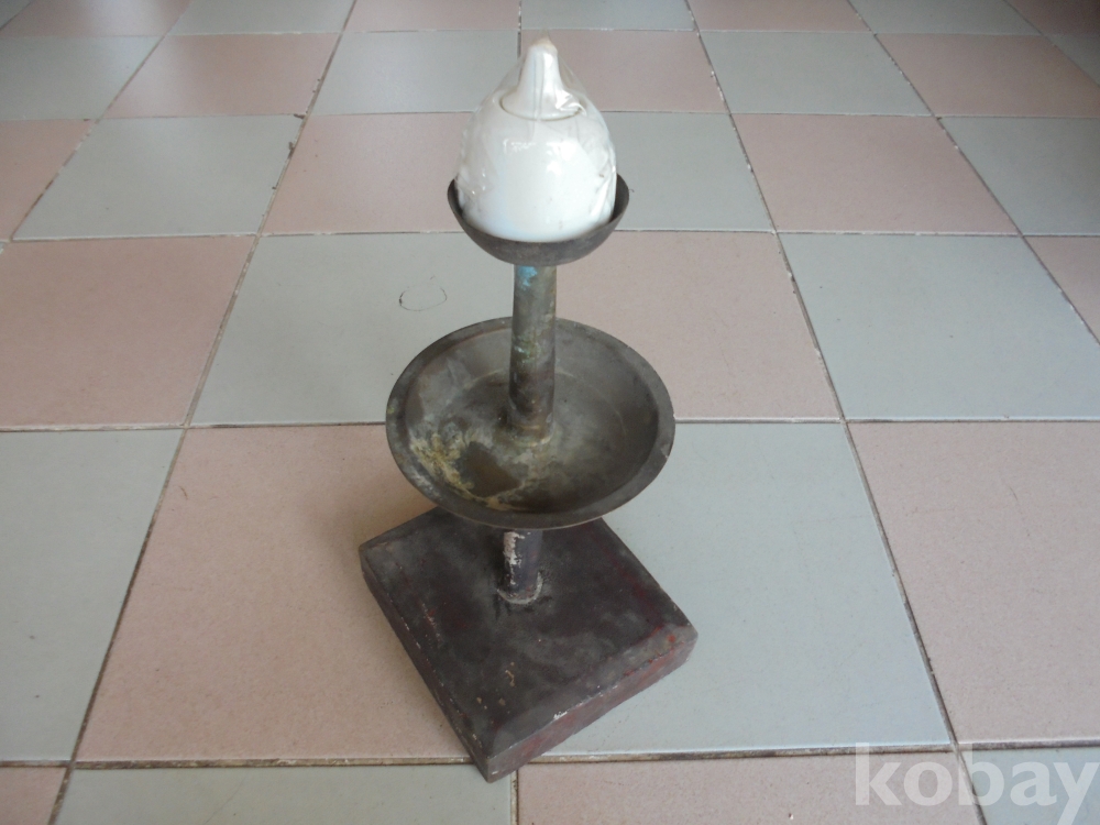 오래되여 때물이좋은 밑바탕이 안정되고 옻칠하였으며 중간위성과 등잔놓은곳 유기로 총3층으로이루어진 인기품인 잘만든 등잔바탕과등잔