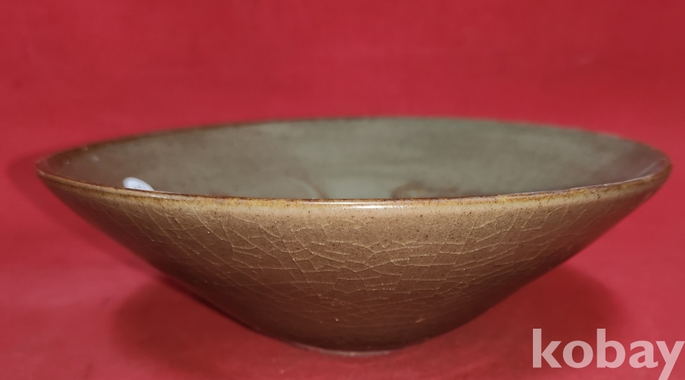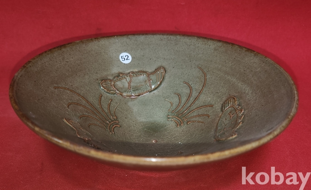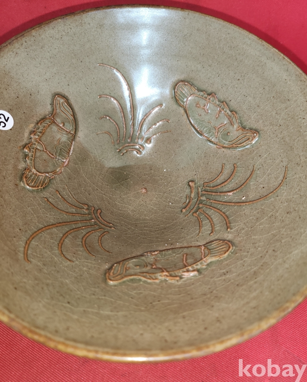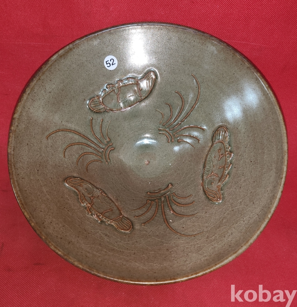 연대좋은 청자 수초와 물고기 3마리 무늬 다완입니다,