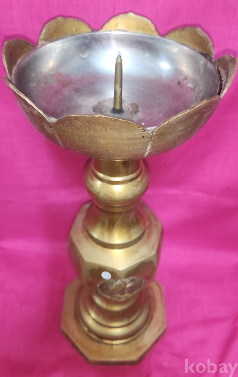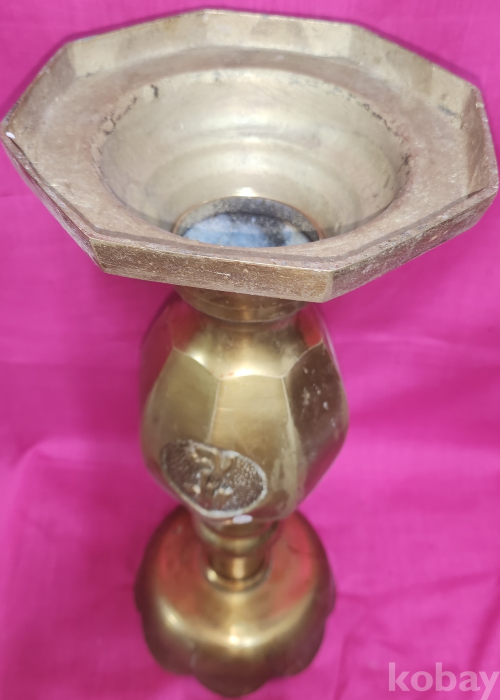 황동으로 만든 불심(佛心) 문자와 옴마니반메훔(唵麽抳鉢銘吽) 뜻 문양 화형 8각 촛대입니다,