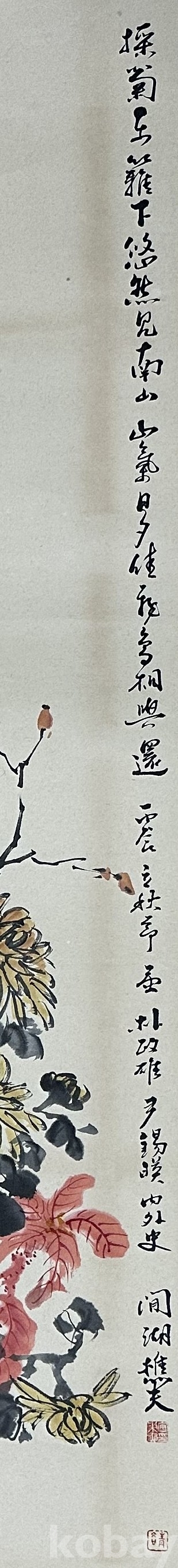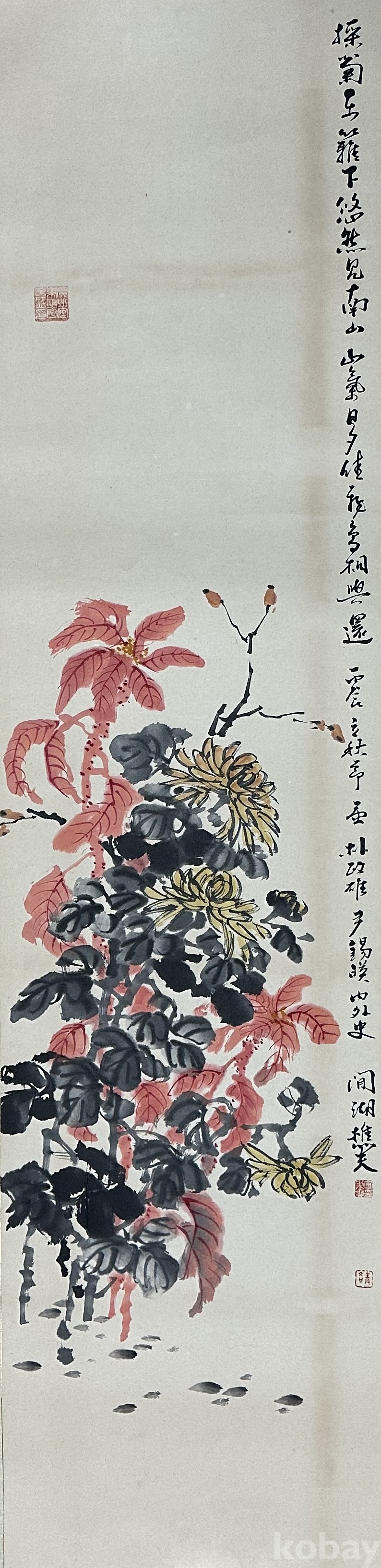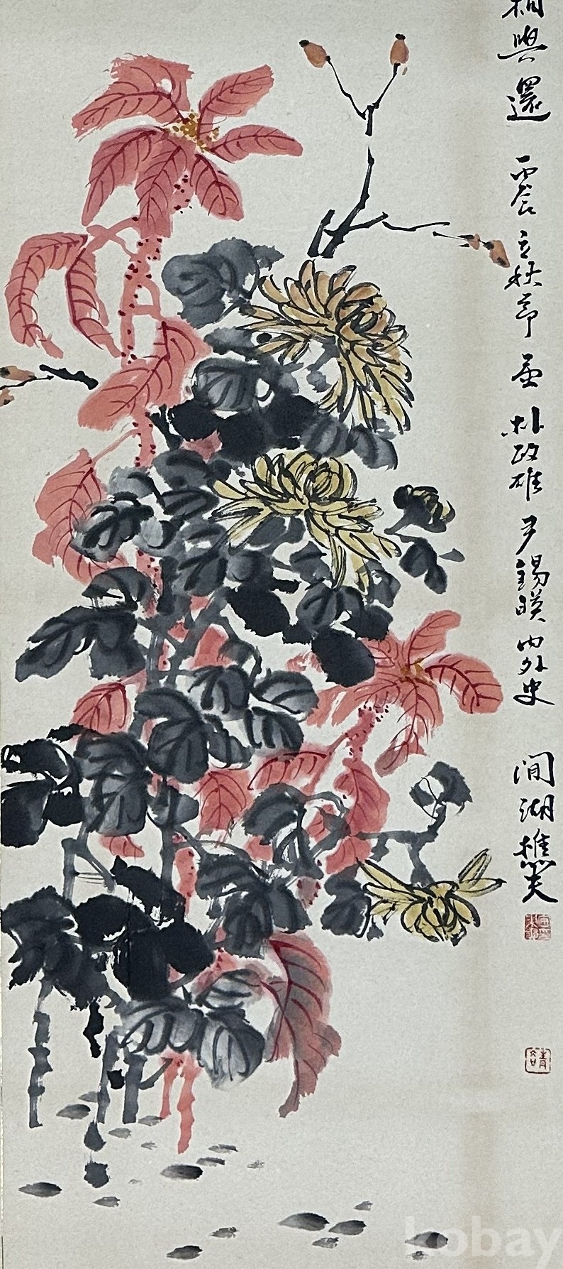 이 작품은 가을을 상징하는 **국화(菊花)**를 중심으로 구성된 전통 수묵채색화입니다. 흑묵으로 그려진 무성한 잎사귀와 더불어 황금빛과 붉은색의 꽃잎이 대비를 이루며 생동감 있게 화면을 채우고 있습니다.