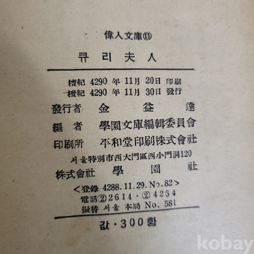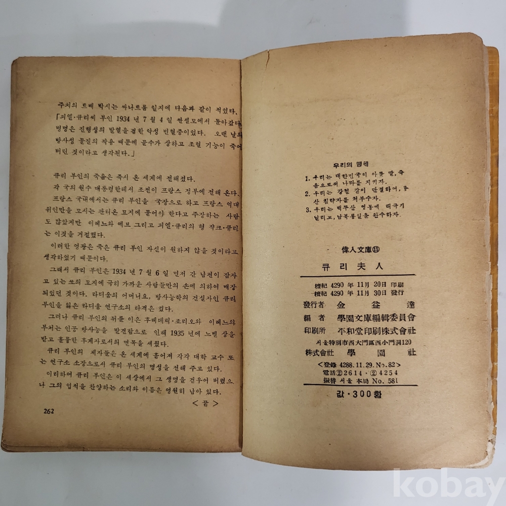 [희귀 근대사 자료] / [큐리 부인] / 4290.11.30일 학원사 초판 발행 / 세계위인문고