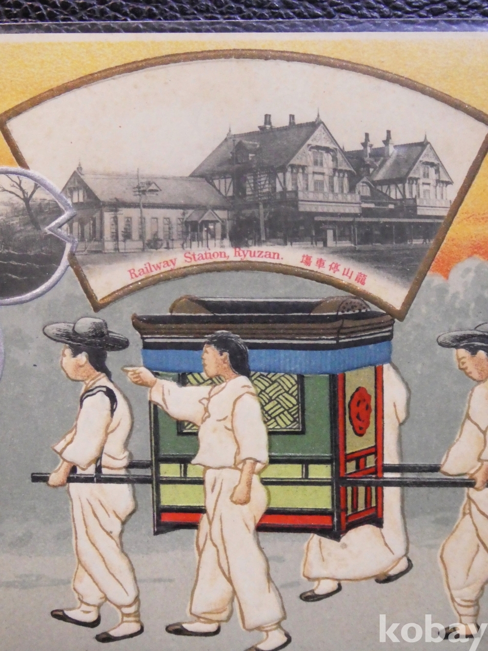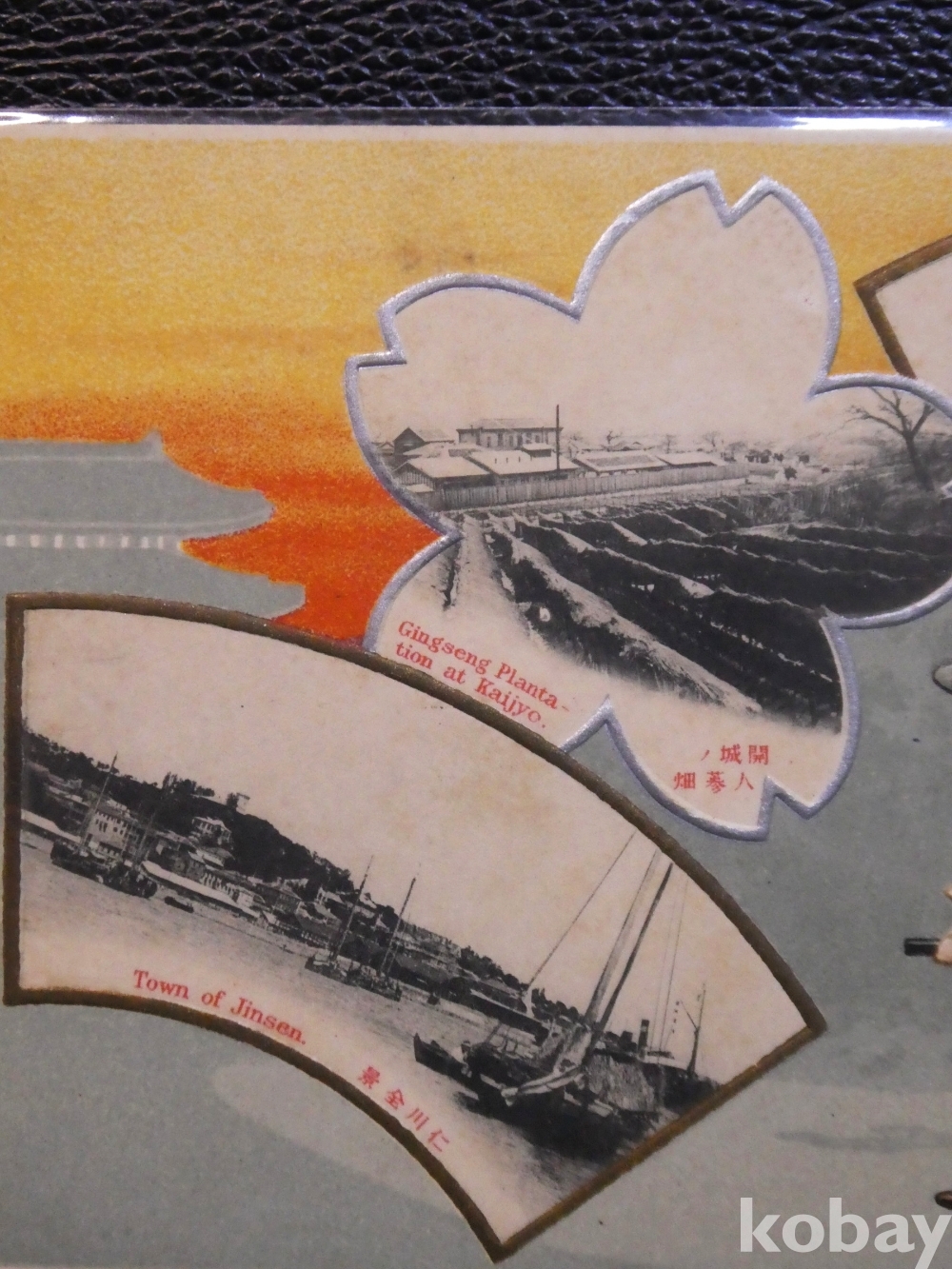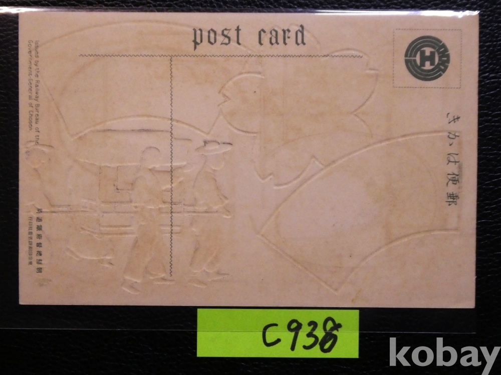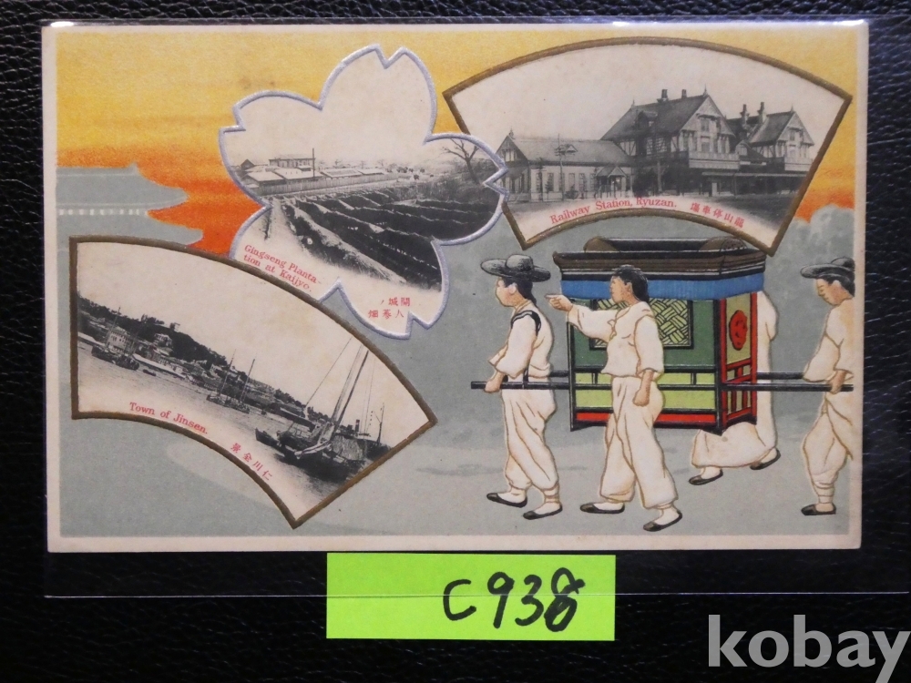 ▣한국근대엽서(진본): 조선총독부철도국 홍보엽서, 용산정차장, 개성의 인삼, 인천항 전경, 가마타는 디자인, 엠보씽처리, 매우 희귀/1매.