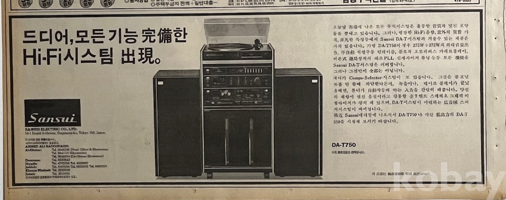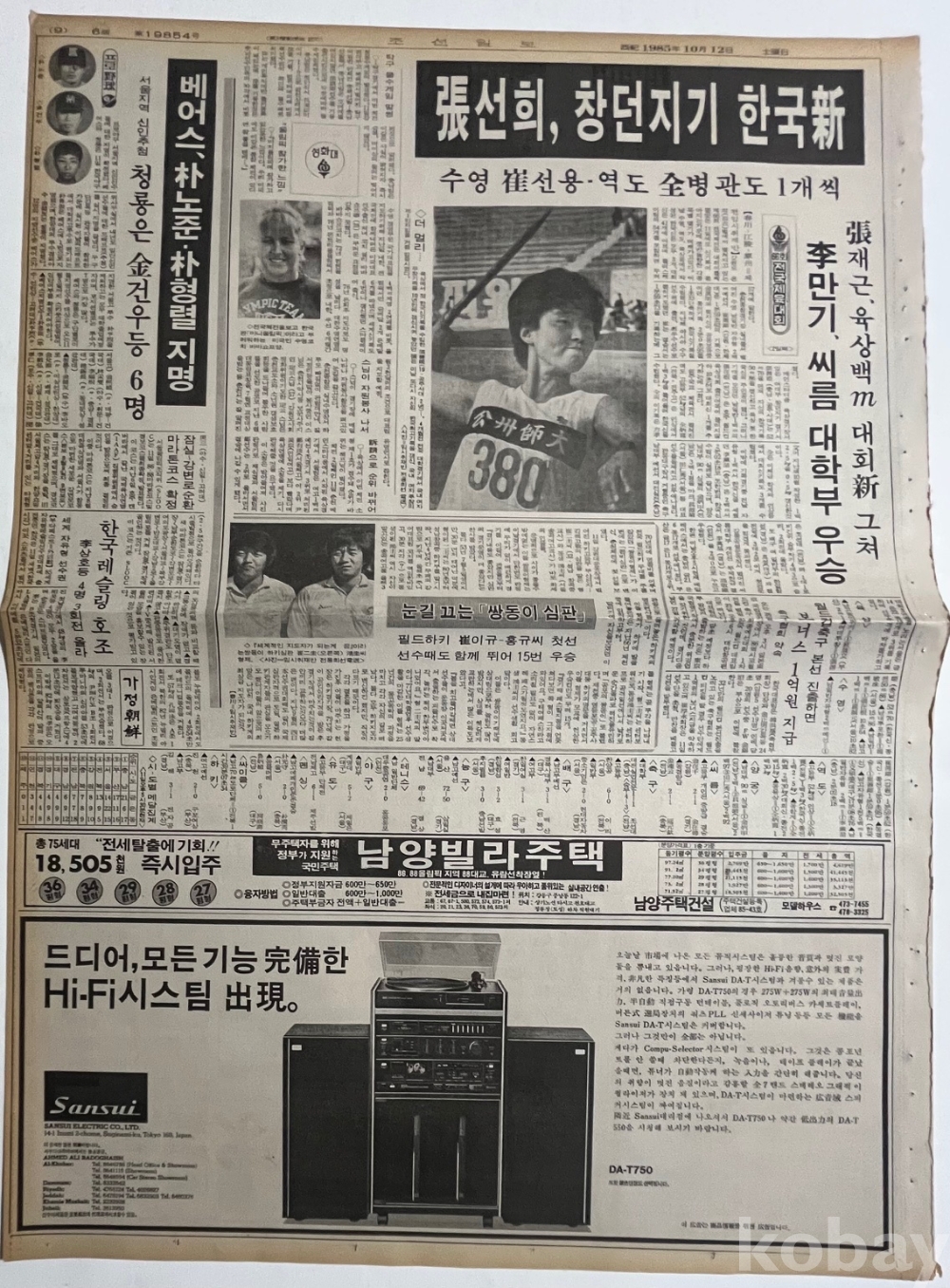 산수이 오디오 신문광고가 실린 조선일보 낱장입니다.