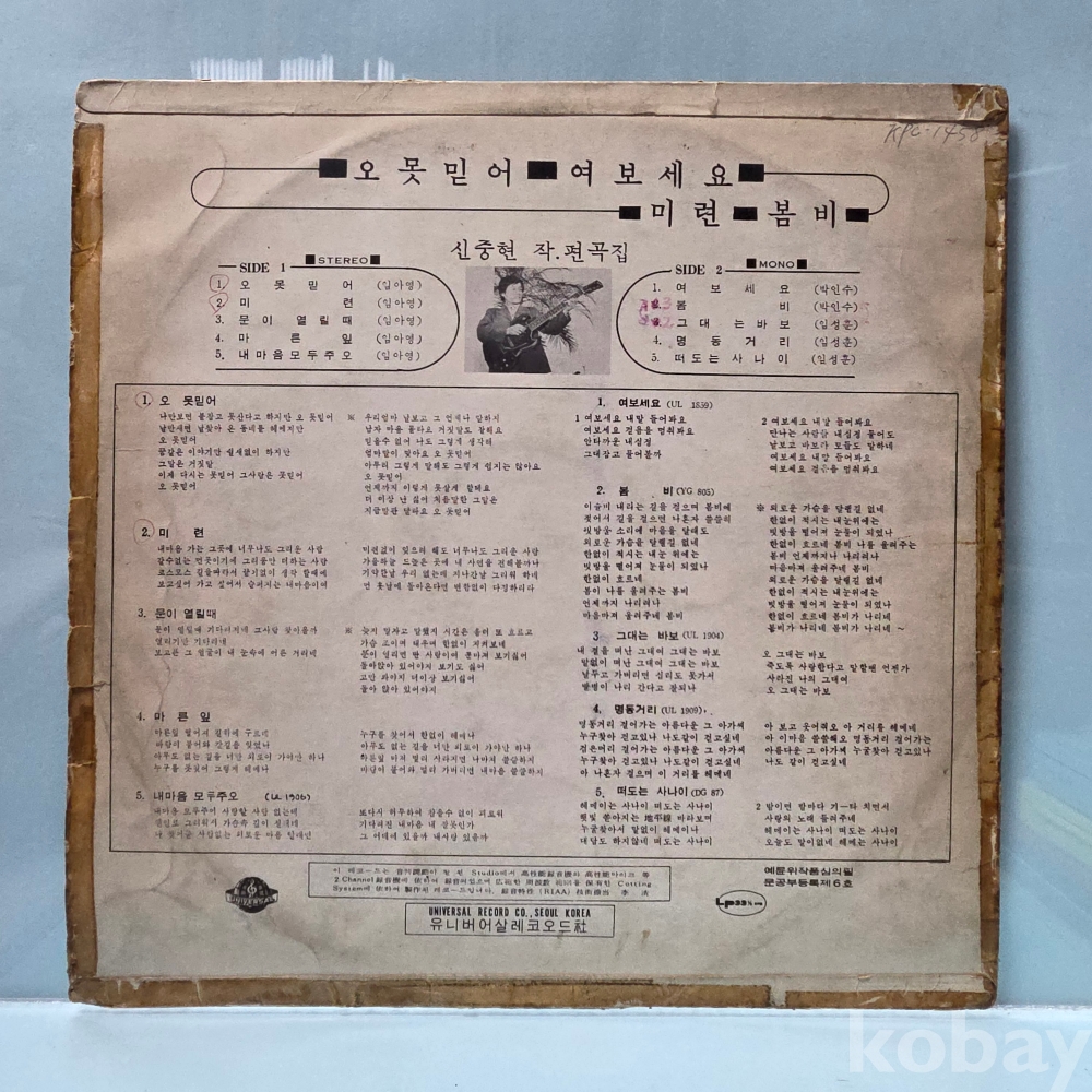 | 자켓상태 | VG : 주름, 접힘, 모서리 찢김 다수 | 음반상태 | EX : 재생에 영향 없는 가벼운 기스 존재 | 발매정보 | 초반 | 가사지여부 | 무 |