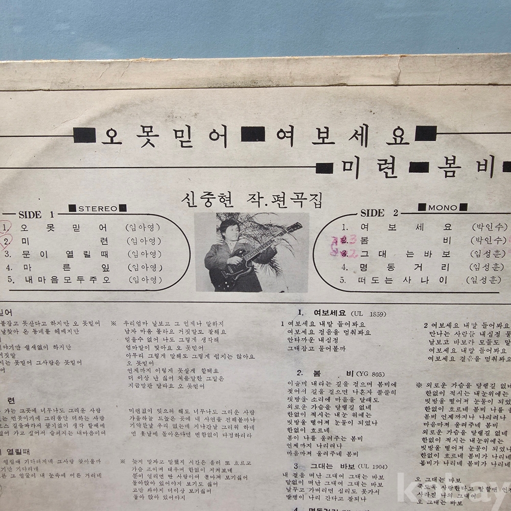 상품 설명 | Side A 1. 오 못믿어 2. 미련 3. 문이 열릴때 4. 마른잎 5. 내마음 모두주오 Side B 1. 여보세요 2. 봄비 3. 그대는 바보 4. 명동거리 5. 떠도는 사나이 |