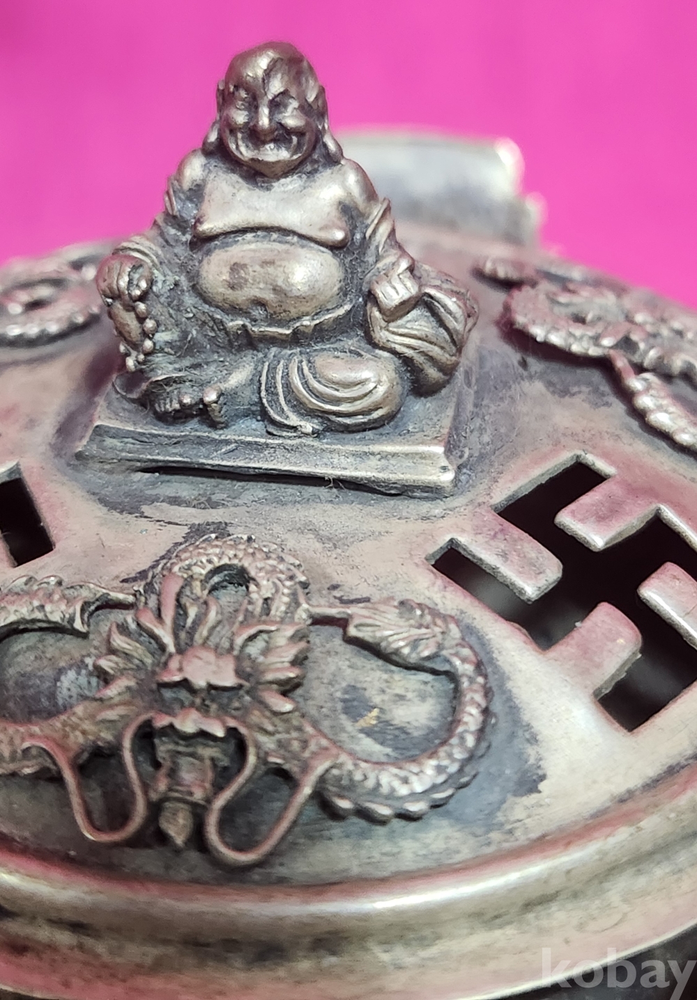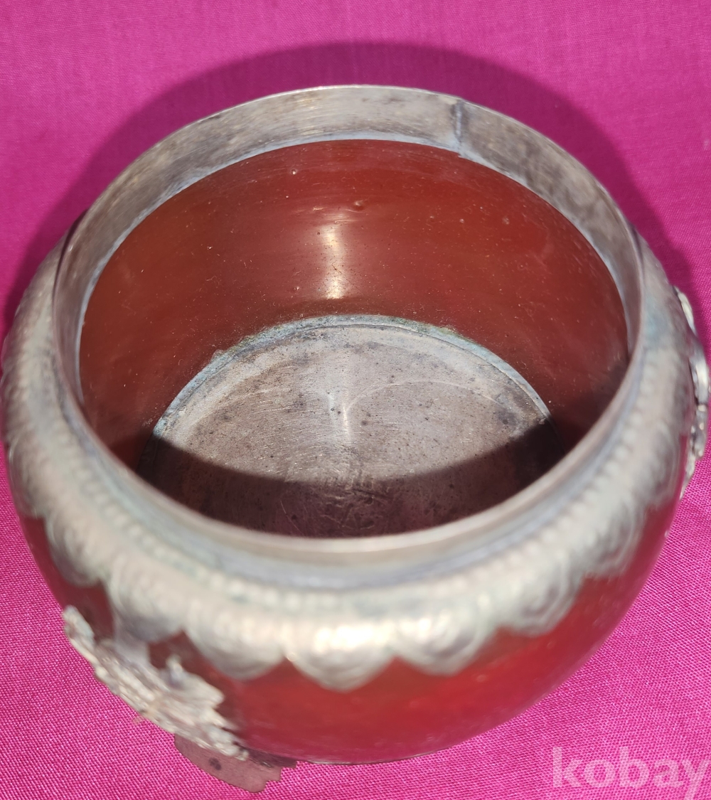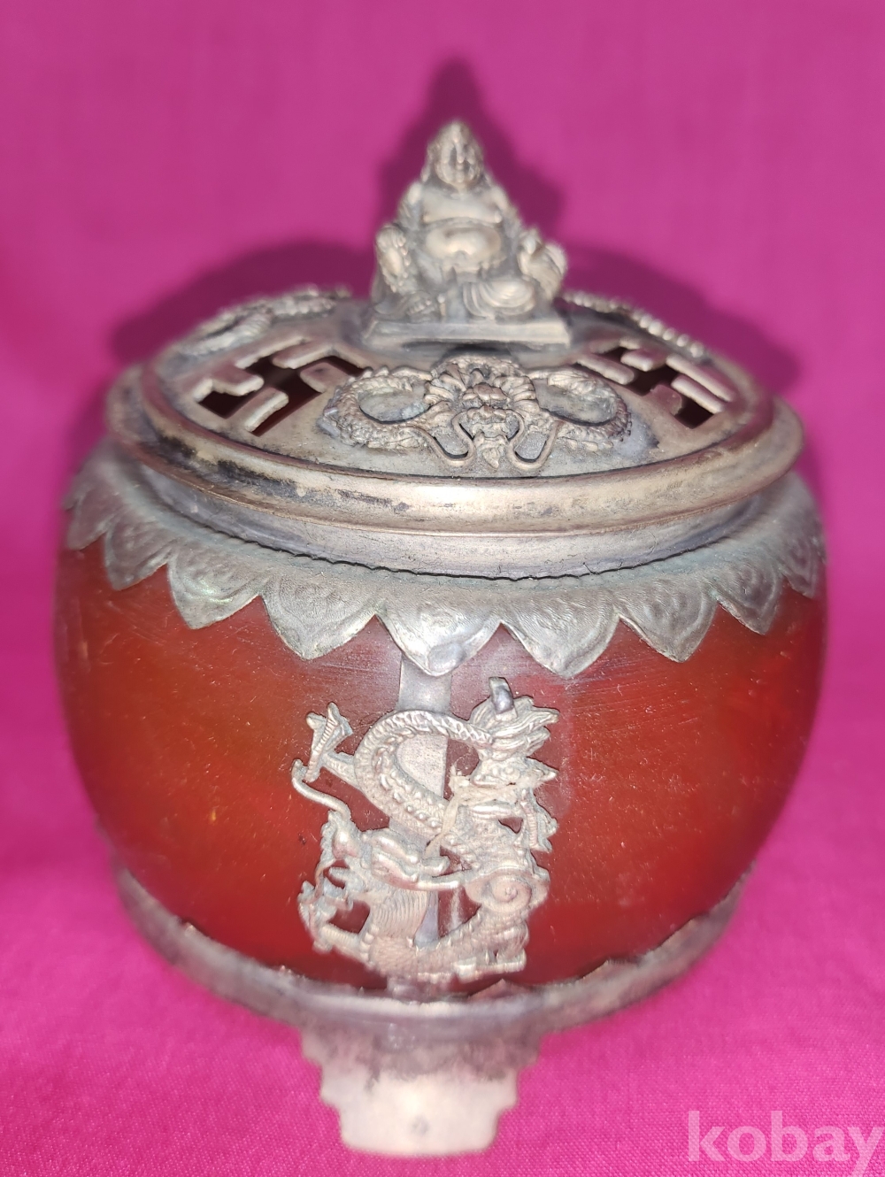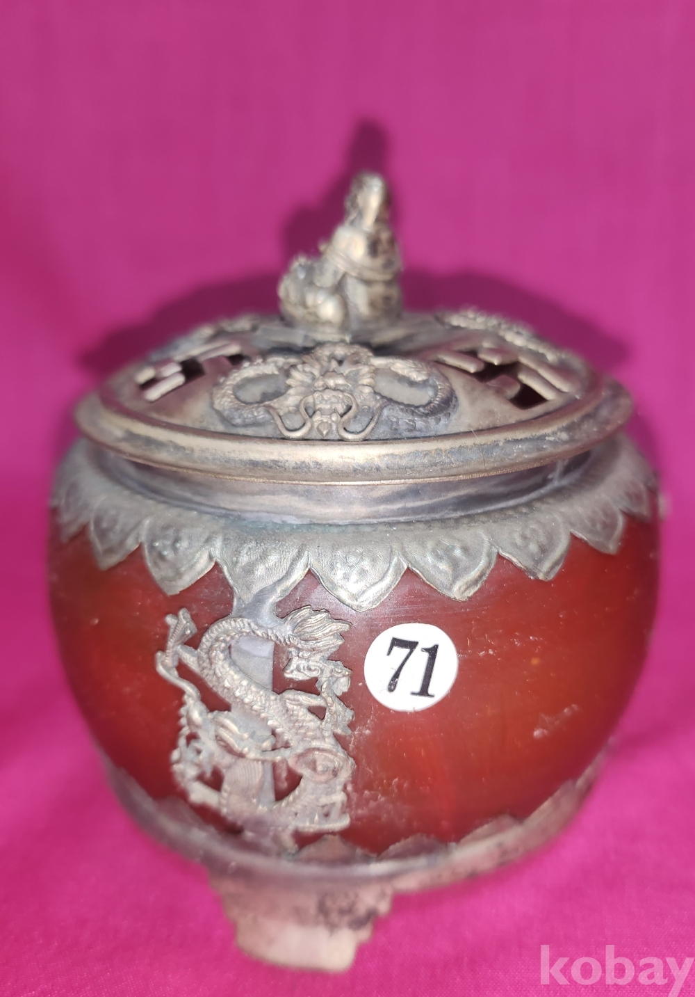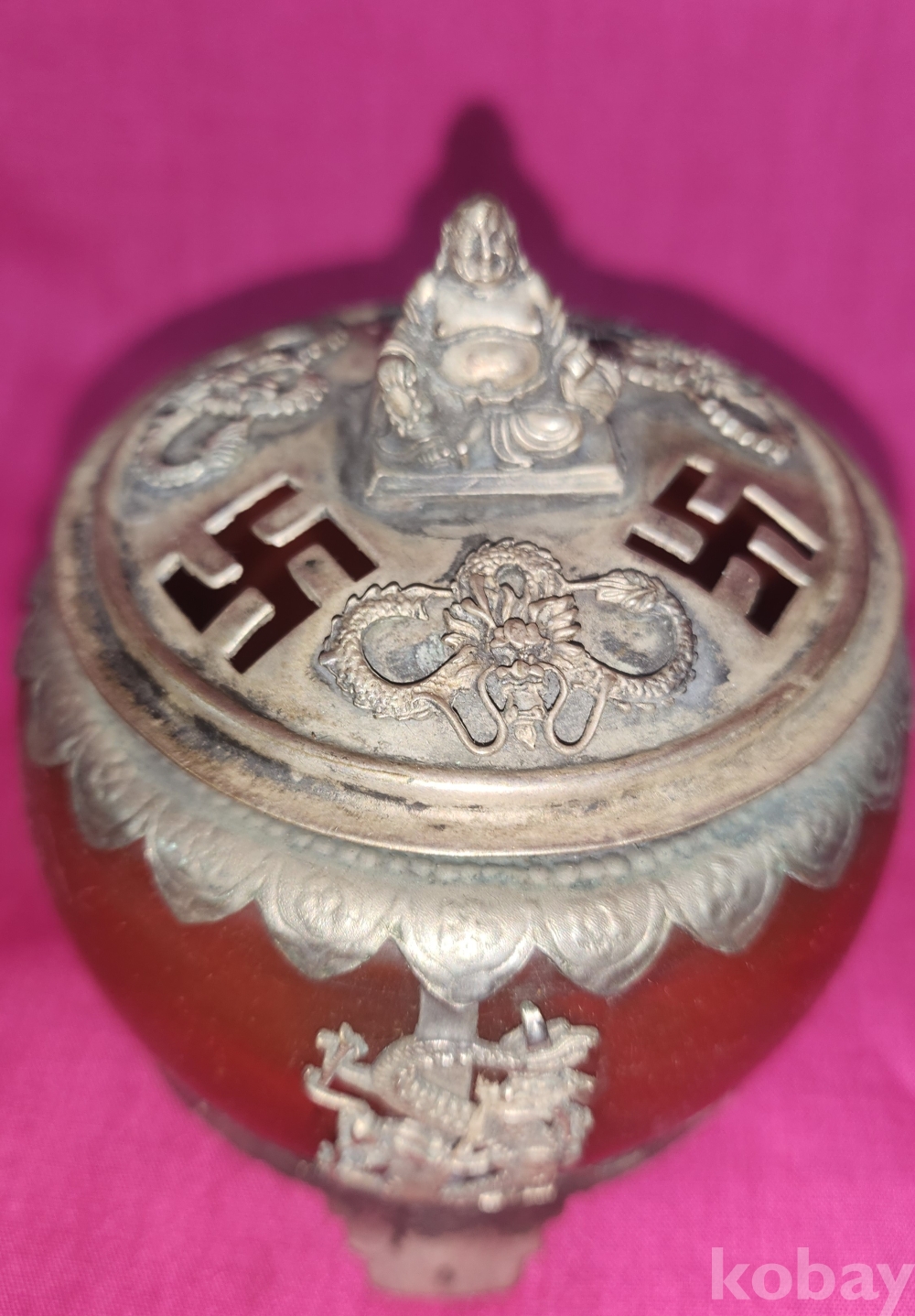 붉은색 옥에 백동 장식 용과 만(卍) 문양 삼족 향로입니다,