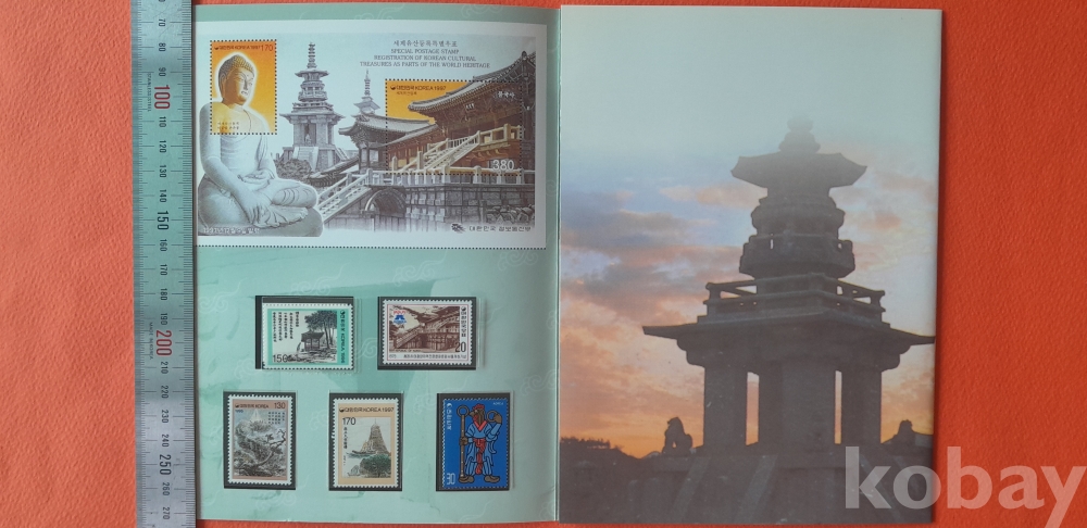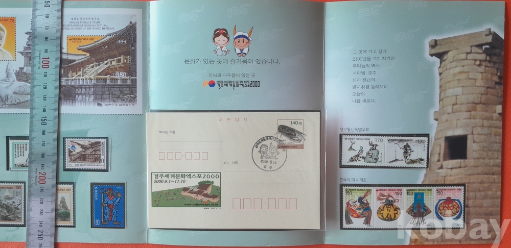 석굴암,불국사 문화유산 시트렛 1매, 각종 우표 11매, 기념우편엽서 1매가 첩부되어 있습니다.