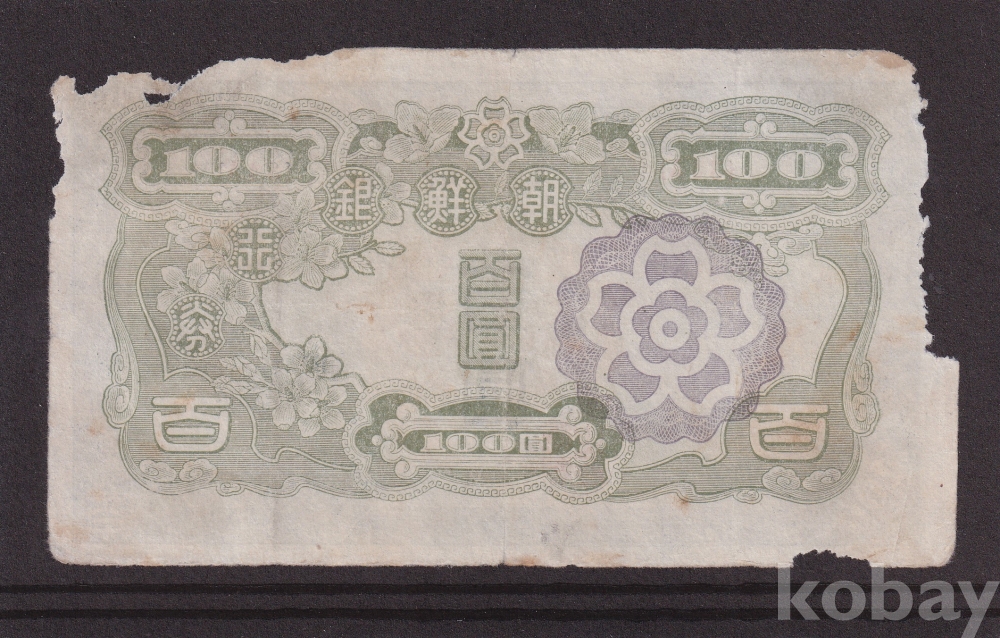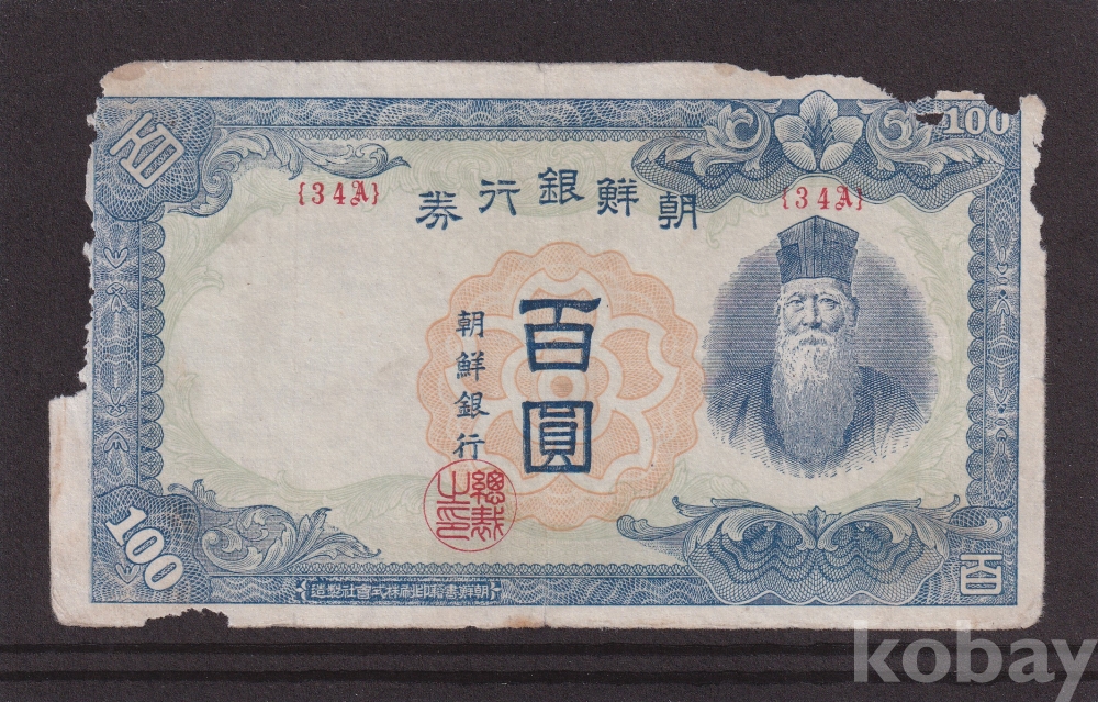 - 조선은행 무백원 백색지 판번호 34A 사용제 지폐