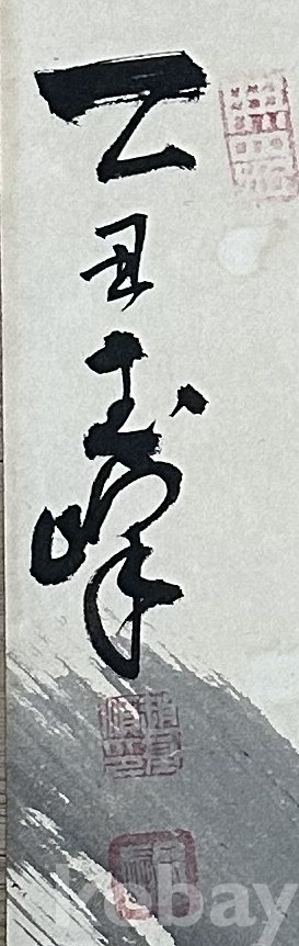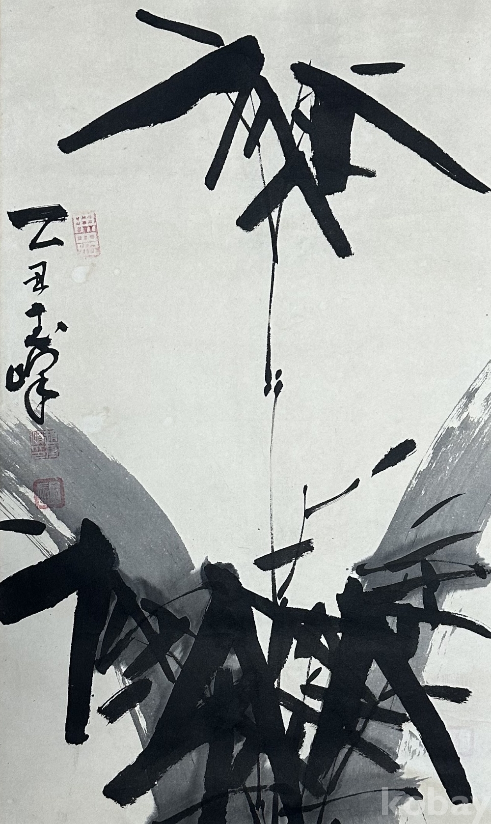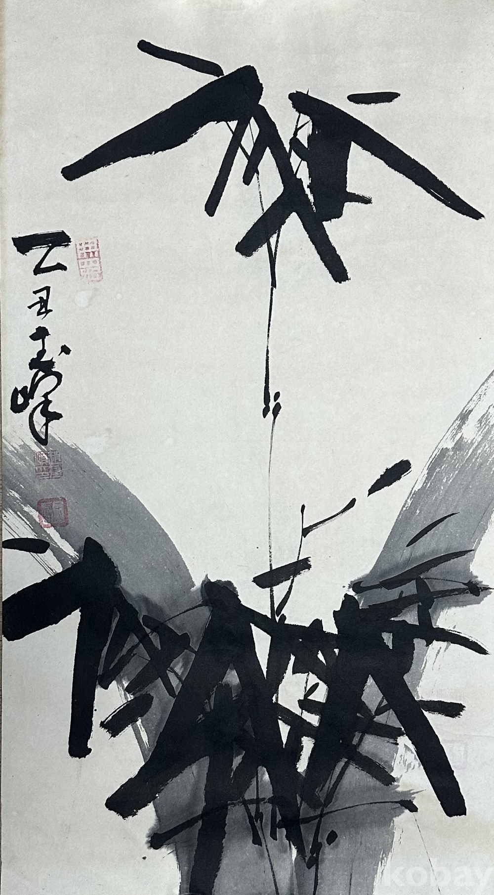 본 작품은 강렬한 붓의 움직임과 농묵·담묵의 대비로 구성된 추상 서예 작품입니다. 붓의 속도감이 시원스럽게 살아 있으며, 전통 서예의 기운생동(氣韻生動)과 현대적 공간 구성이 공존하는 독창적 작품입니다. 화면 중심의 수직적 선과 비대칭적 구성이 긴장감을 주며, 먹의 번짐과 여백을 적극적으로 활용하여 동양적 여운을 남깁니다. 좌측에는 ‘乙丑 峰’이라 적혀 있고, 두 개의 인장이 찍혀 있어 작가의 완성도 높은 작업임을 보여줍니다.