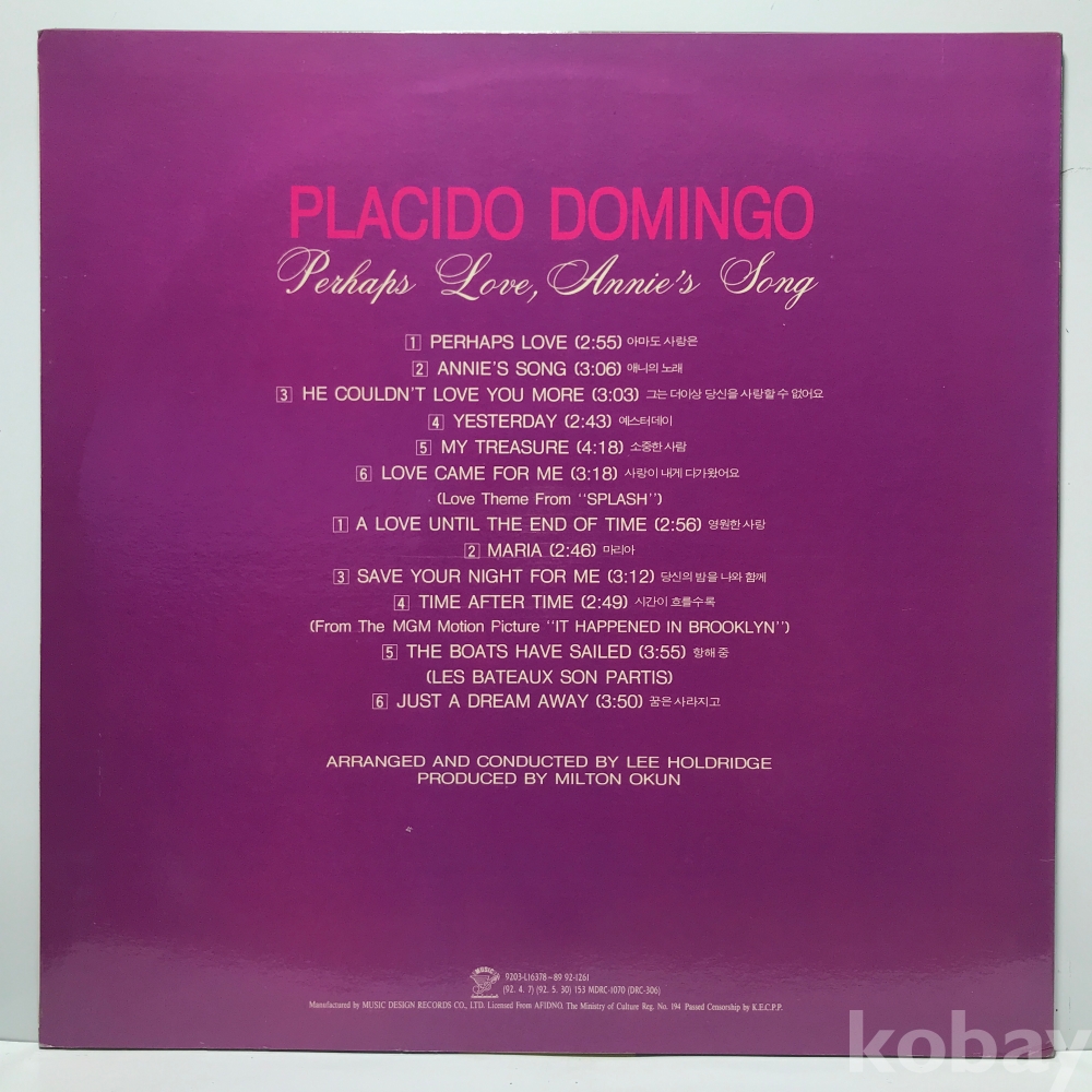 LP 35,450-18 플라시도 도밍고 & 존 덴버 - Perhaps Love . ` 92 뮤직디자인 자켓 EX+ 알판 EX