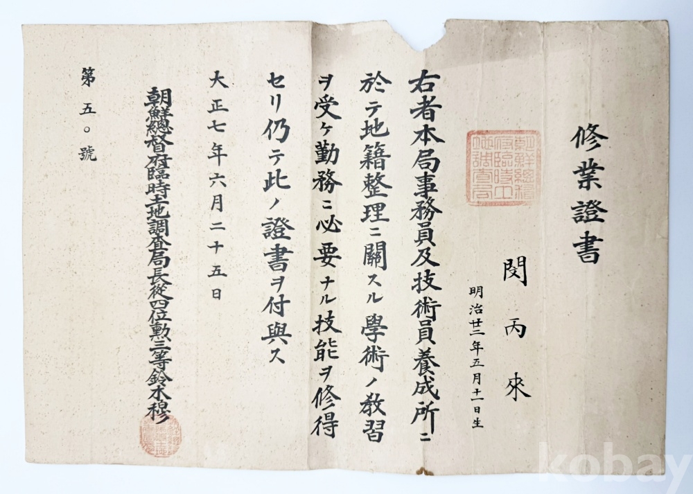 상품 설명 | 조선총독부 토지조사국의 교원 및 기술원 양성소에서 지적 정리에 관한 학술과 교습을 받아 토지조사국 근무에 필요한 기능을 습득하였음을 증명하는 수업증서 1점이다. | ||