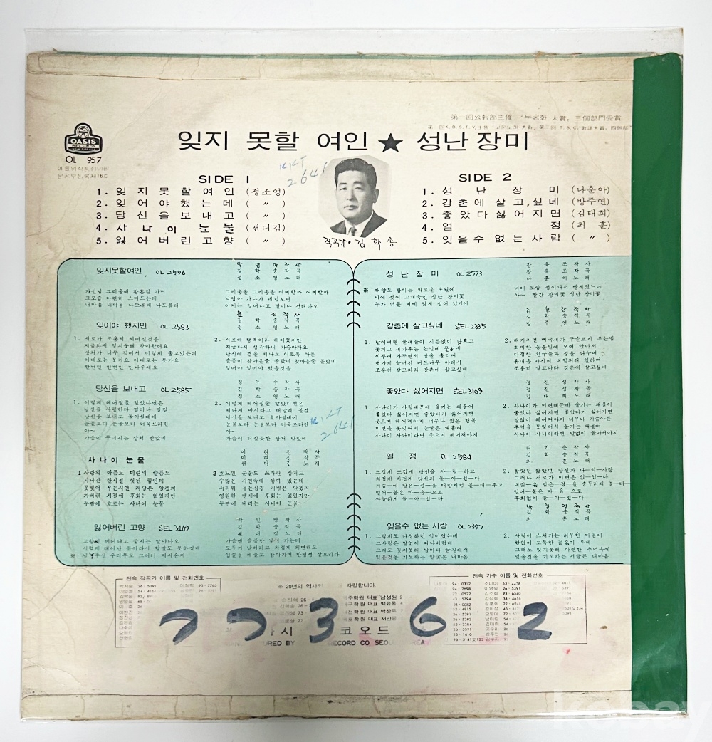 상품 설명 | Side A 1. 잊지 못할 여인 (정소영) 2. 잊어야했는데 (정소영) 3. 당신을 보내고 (정소영) 4. 사나이 눈물 (샌디김) 5. 잃어버린 고향 (샌디김) Side B 1. 성난 장미 (나훈아) 2. 강촌에 살고싶네 (방주연) 3. 좋았다 싫어지면 (김태희) 4. 열정 (최훈) 5. 잊을수 없는 사람 (최훈) | ||