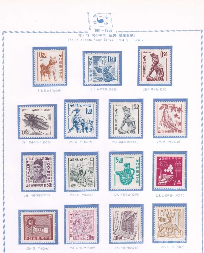 - 한국우표앨범 모음展 - 제1차 국산백지 보통 우표 - 사슴포함 15종 (1964~1966)