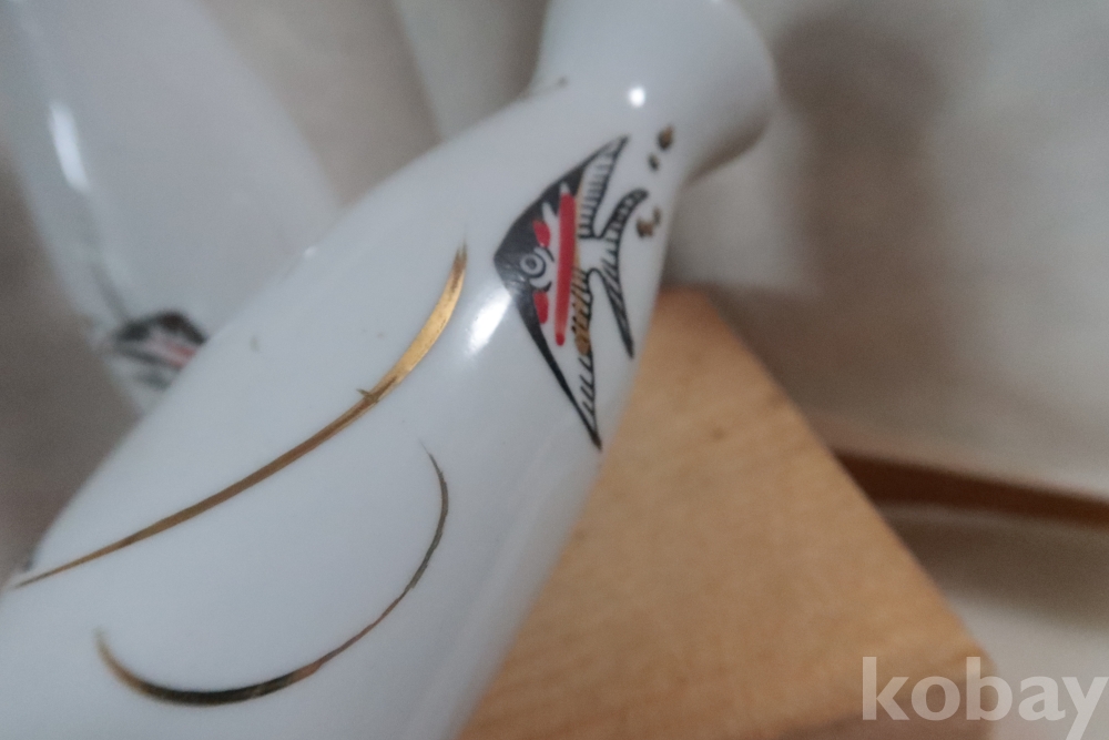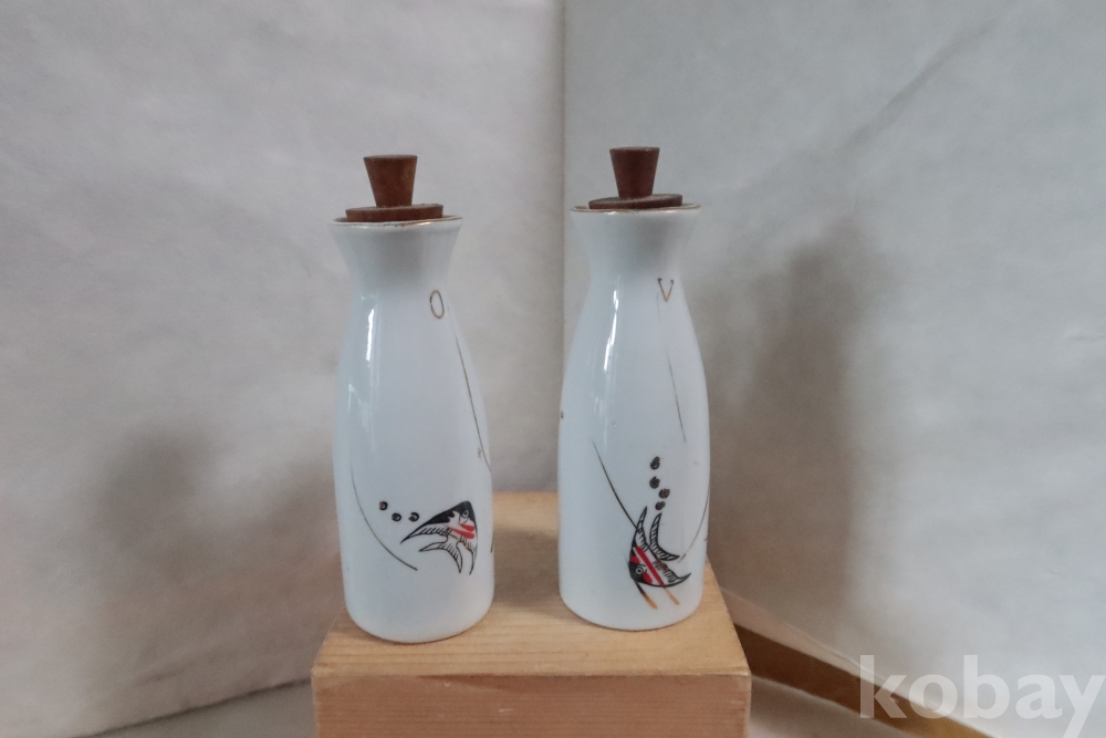 오일 비니거의 영어 o v의 글자와 열대어를 가진 귀한 도자기 2 세트 이며 뚜겅은 코르크 마개 처리되엇읍니다 코르크는 세월 갈라 짐이 보임니다 사진 참조 하세요 귀한 명품 도자기 2 세트 임니다
