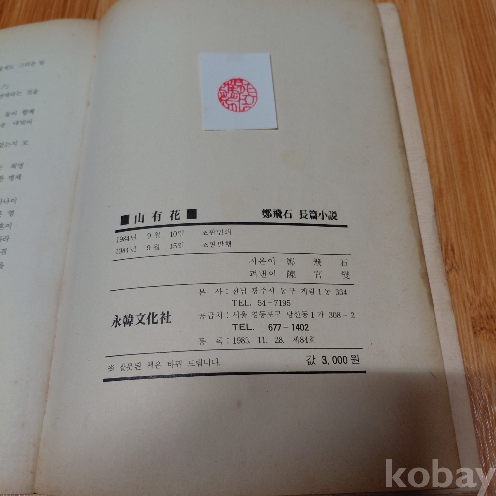 산유화 정비석 장편소설 1984년 수한문화사 발행 올려드립니다