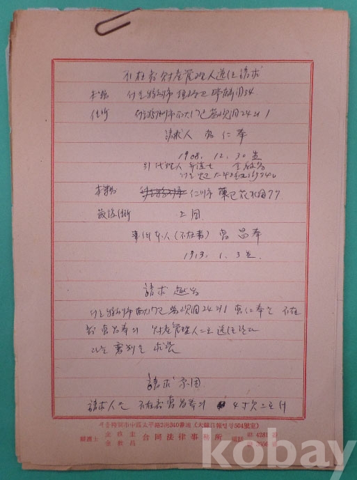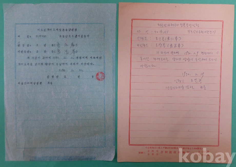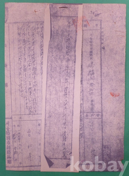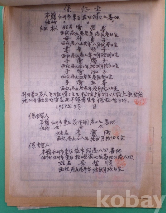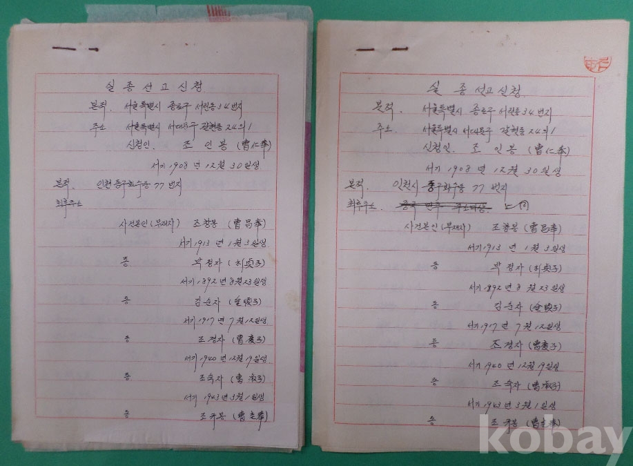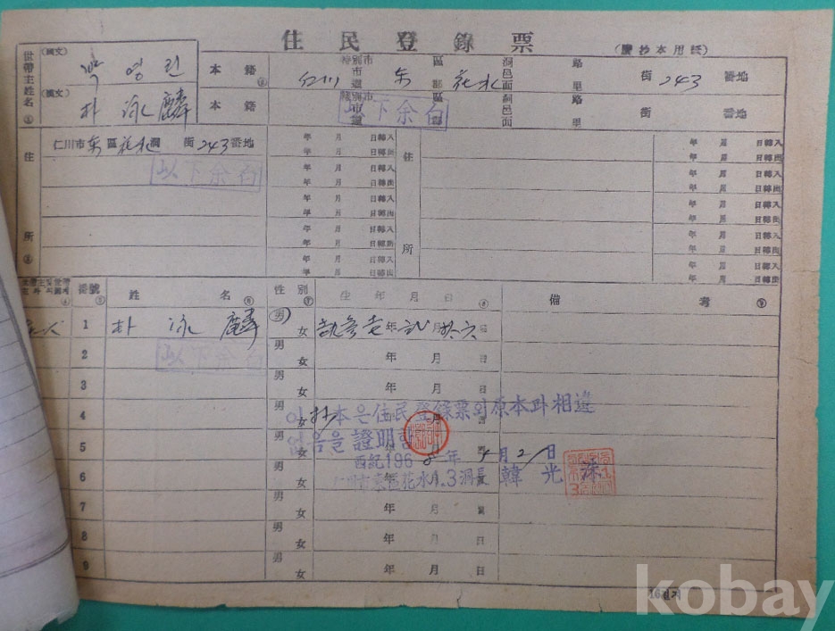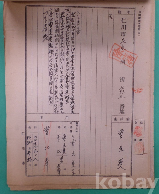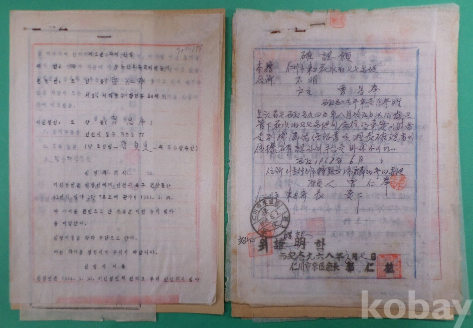 **** 본적 인천시 동구 화수동 77번지 조창봉의 소송관련 자료 일괄(인천시 동구청장 확인원,호적초본,주민등록표 등)