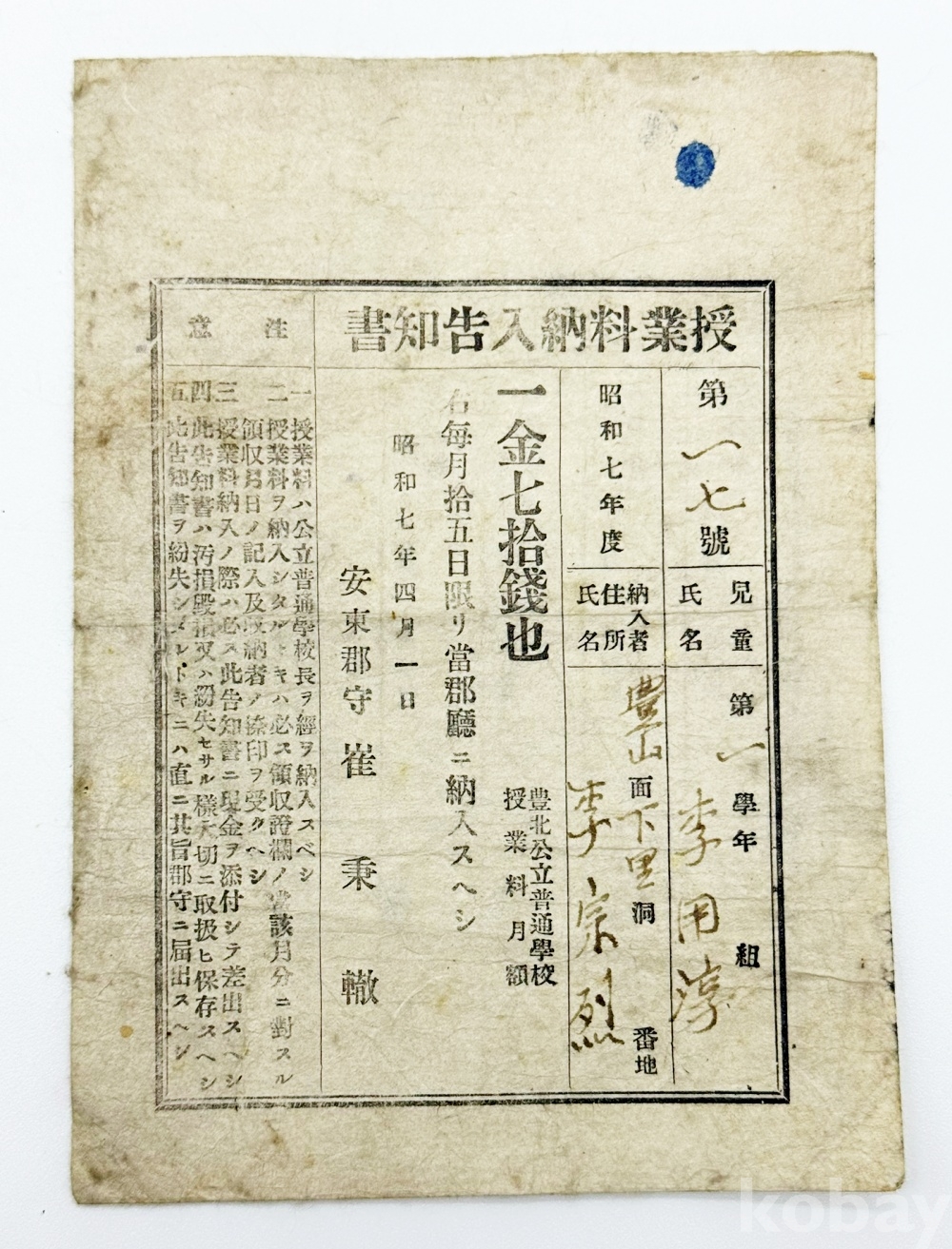 상품명 | 1932년 풍북공립보통학교 ‘수업료납입고지서’ 1점 | ||