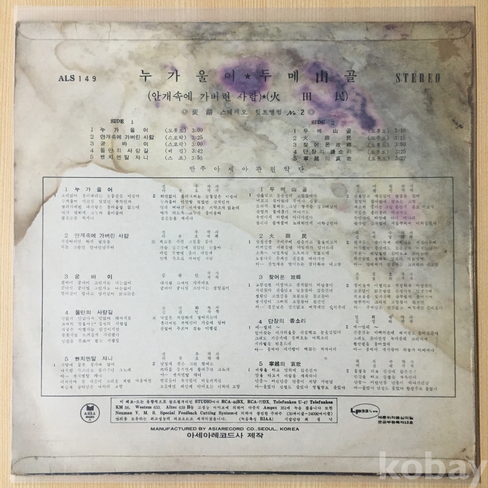 . 가요음반 대부분은 휘어짐이나 손상을 방지하기 위해 무지싱글자킷을 하나 더 사용하여 보관되었던 음반들입니다.