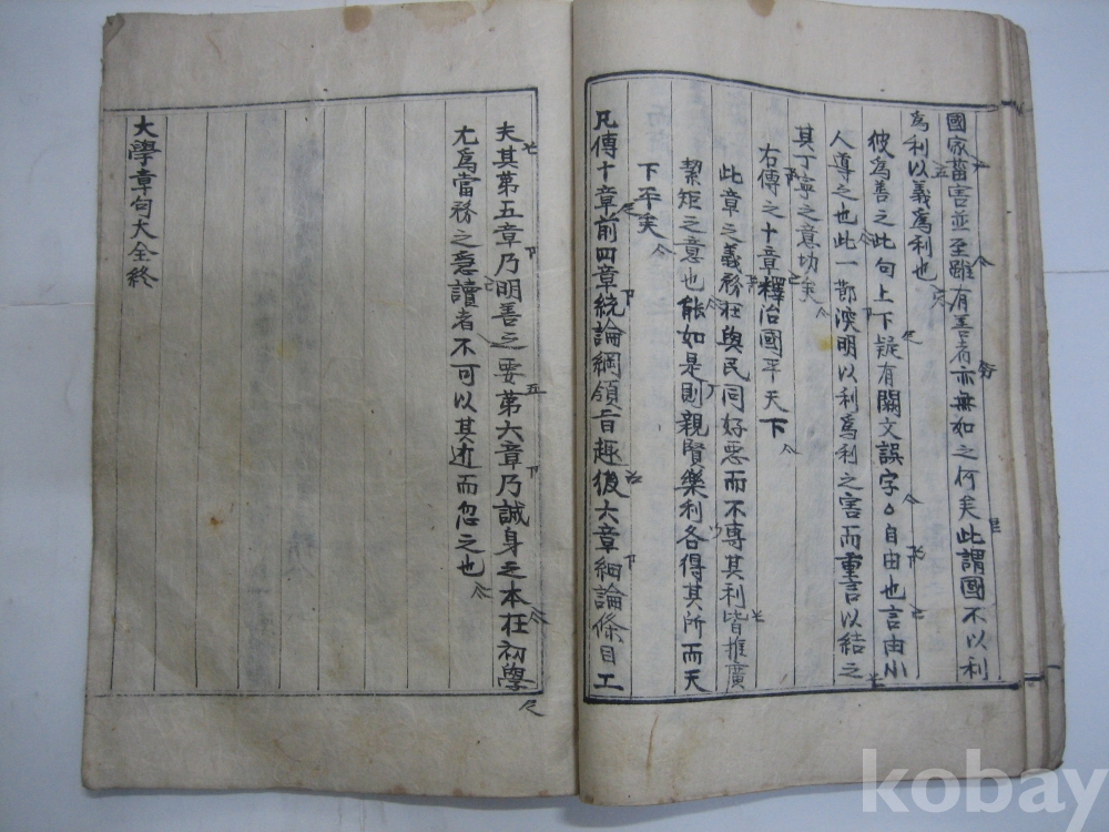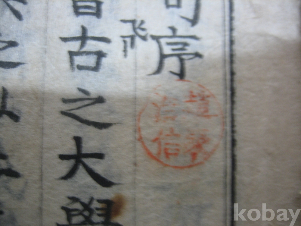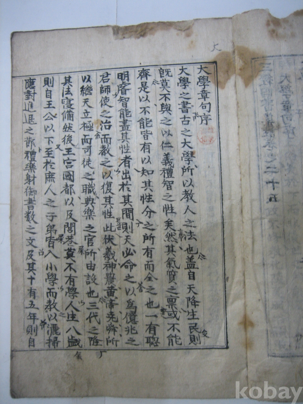 8. 내용 : 맨 뒷장에 조병호(趙秉浩) 등서(謄書) 호남(湖南) 청계정사(聽溪精舍)라고 쓰여 있으며, 맨 앞쪽 첫 장 대학장구서(大學章句書) 밑에 조병호(趙秉浩, 사진 3)이라는 도장이 찍혀 있습니다. 조병호는 한말에 학부대신, 내부대신, 탁지부 대신, 충청도, 황해도 ,경상도 관찰사를 지낸 분입니다. 맨 뒷장에 조병호(趙秉浩)가 베꼈다는 뜻으로 등서(謄書)라고 쓰여진 부분에 검은 먹물이 묻혀져 있으나 자세히 보면 조병호(趙秉浩)를 읽을 수 있습니다.